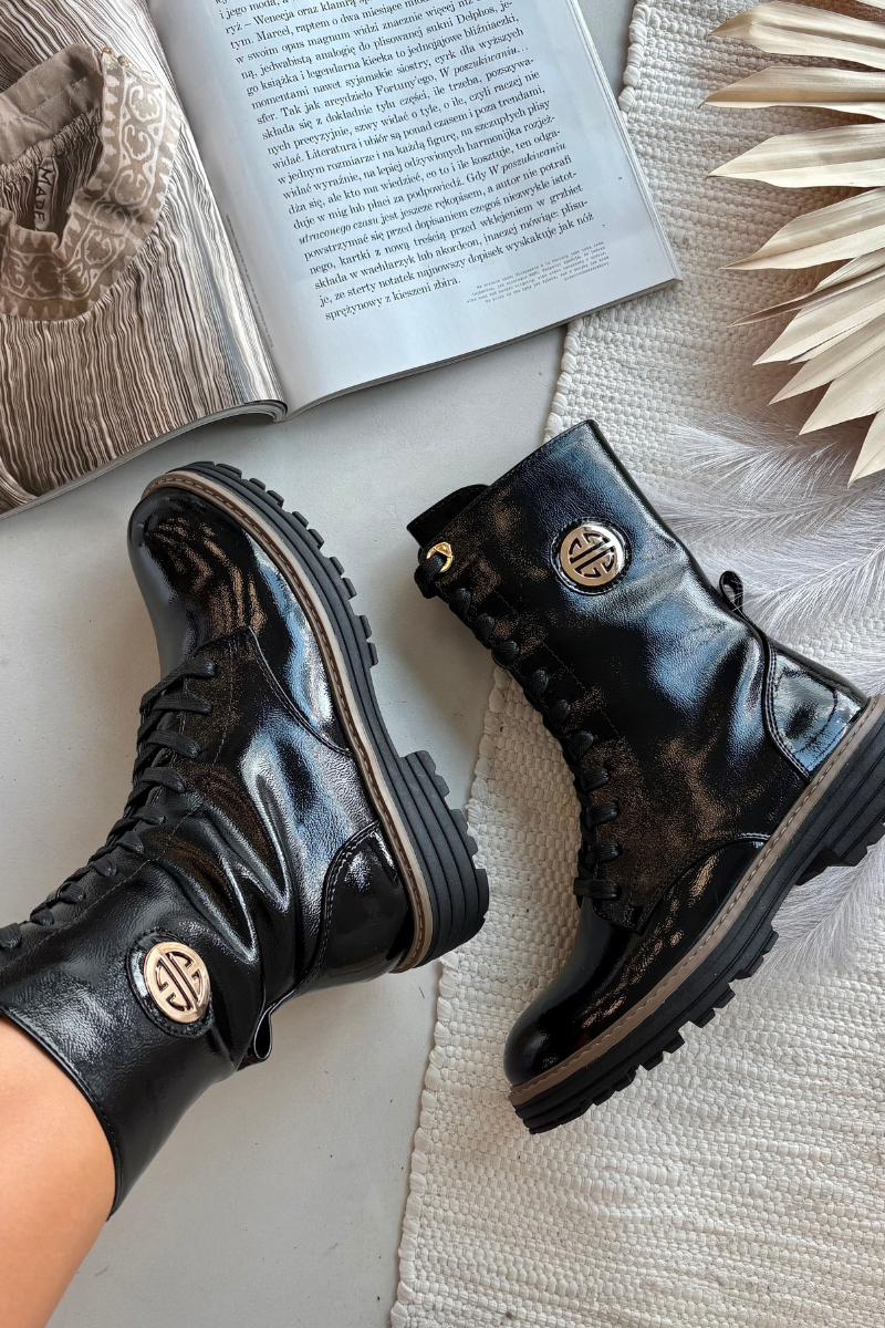 Lakierowane Botki Workery Damskie Ze Złotym Detalem Ocieplane Czarne Dorialine