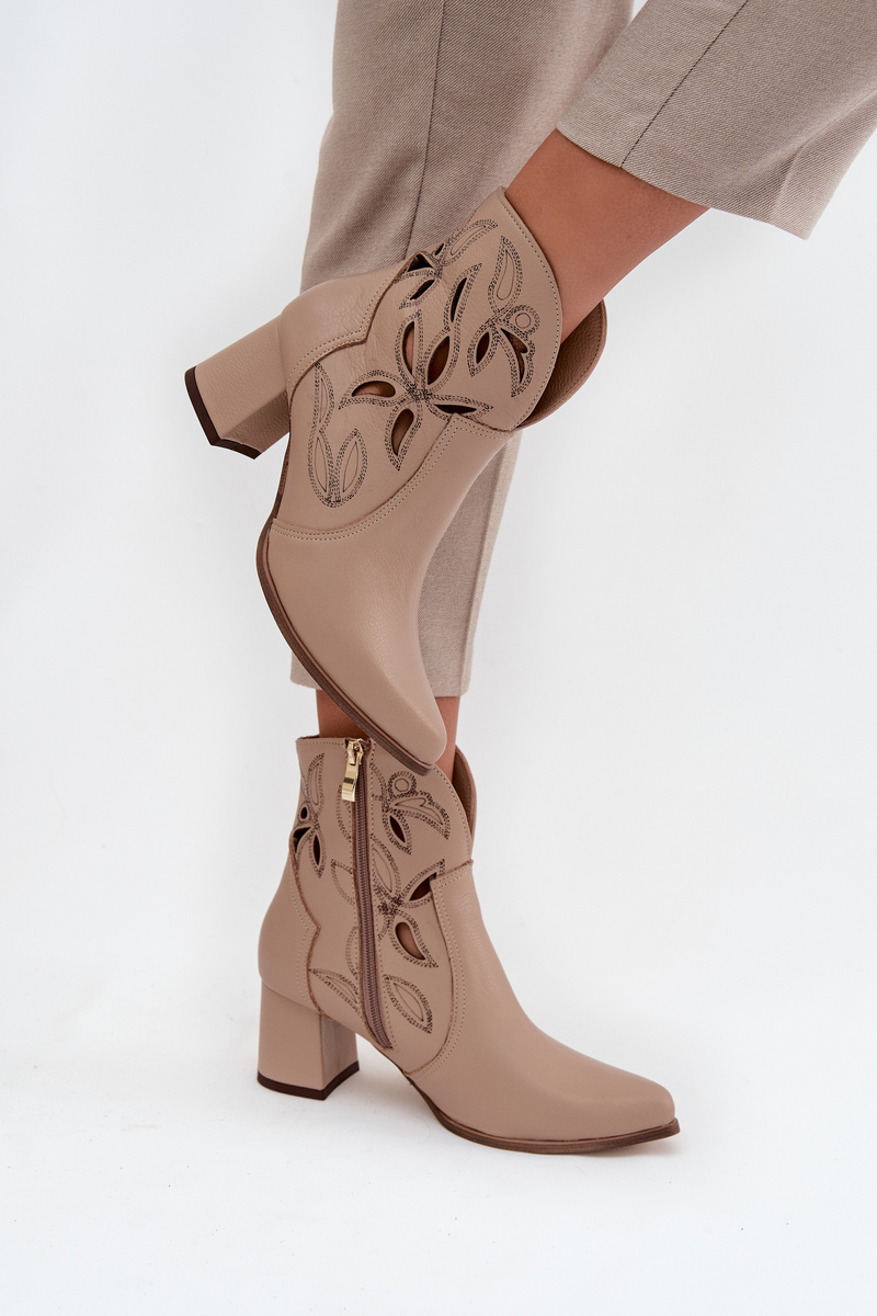 Skórzane Ażurowe Botki Damskie Na Słupku Zazoo 3647 Jasnobeżowe