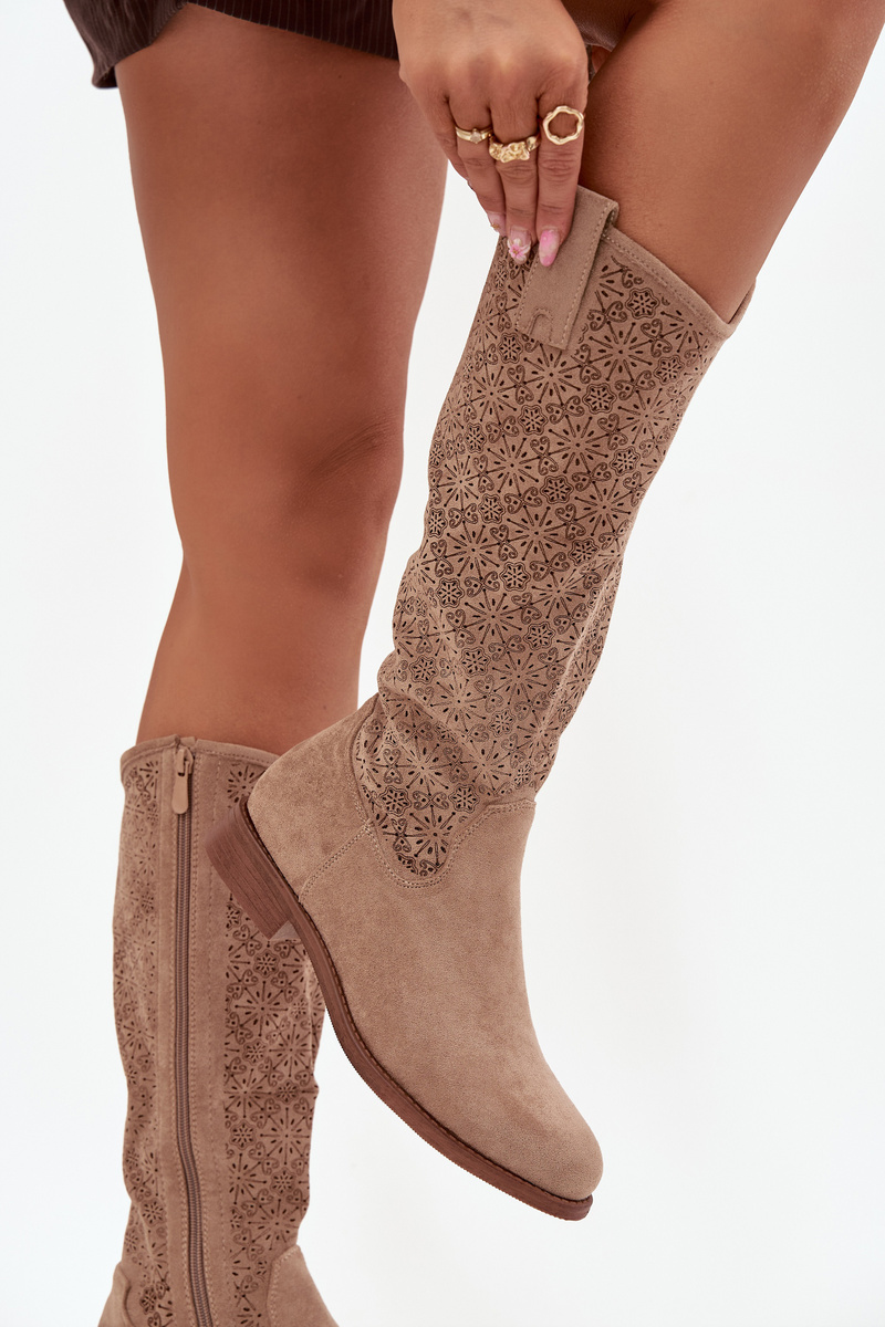 Kozaki Damskie Ażurowe Na Płaskim Obcasie S.Barski HY52-534 Beżowe