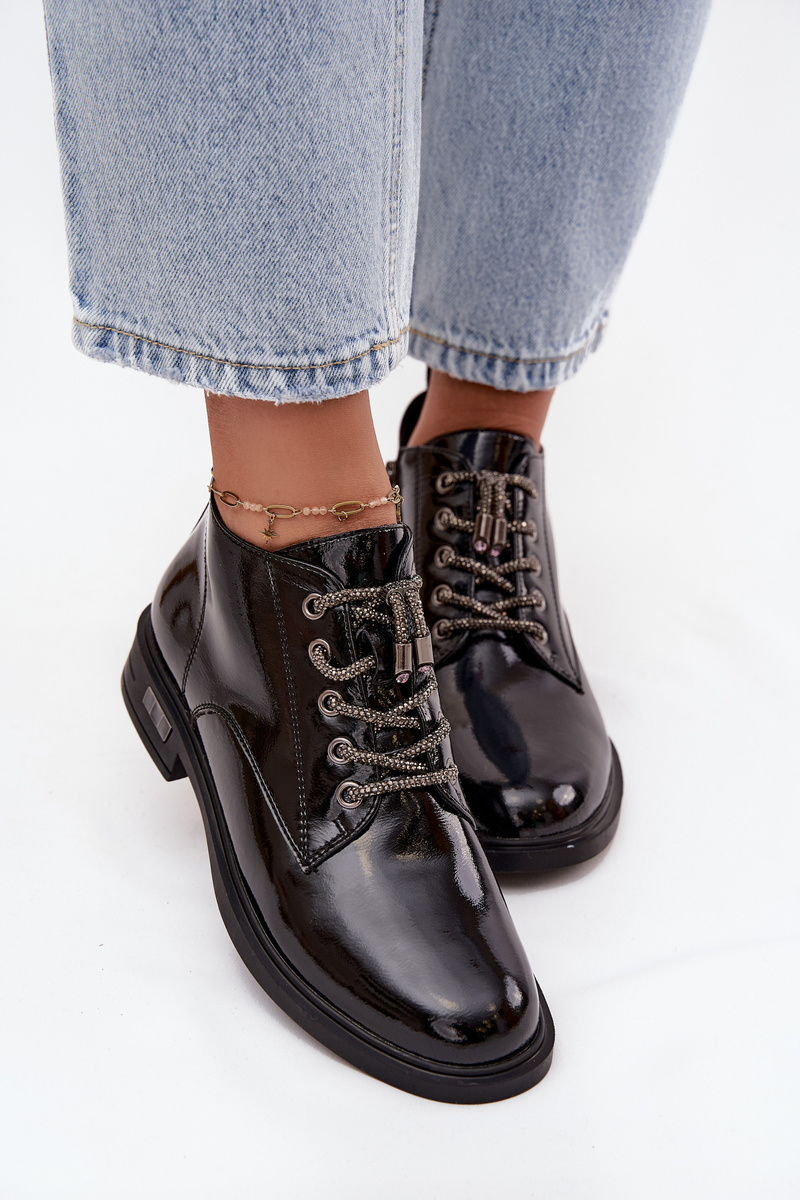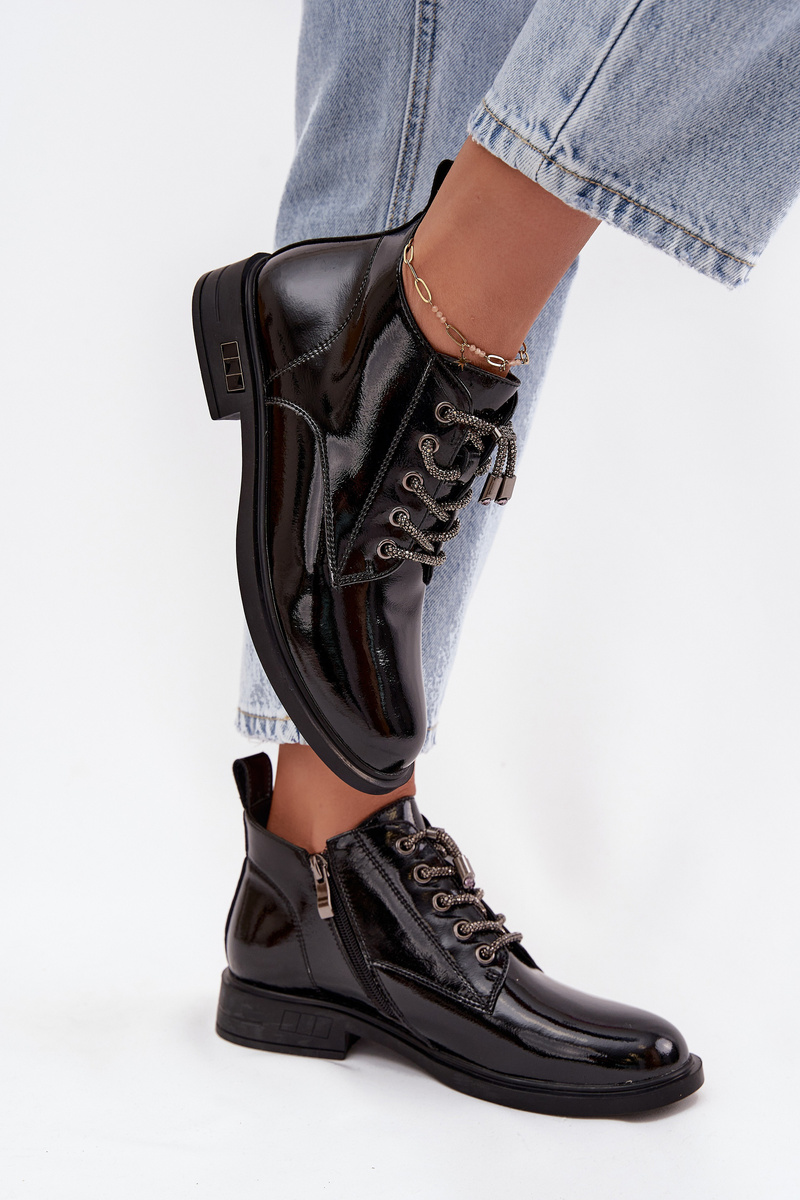Skórzane Lakierowane Botki Damskie Z Ozdobnym Sznurowaniem D&A MR52-124 Czarne