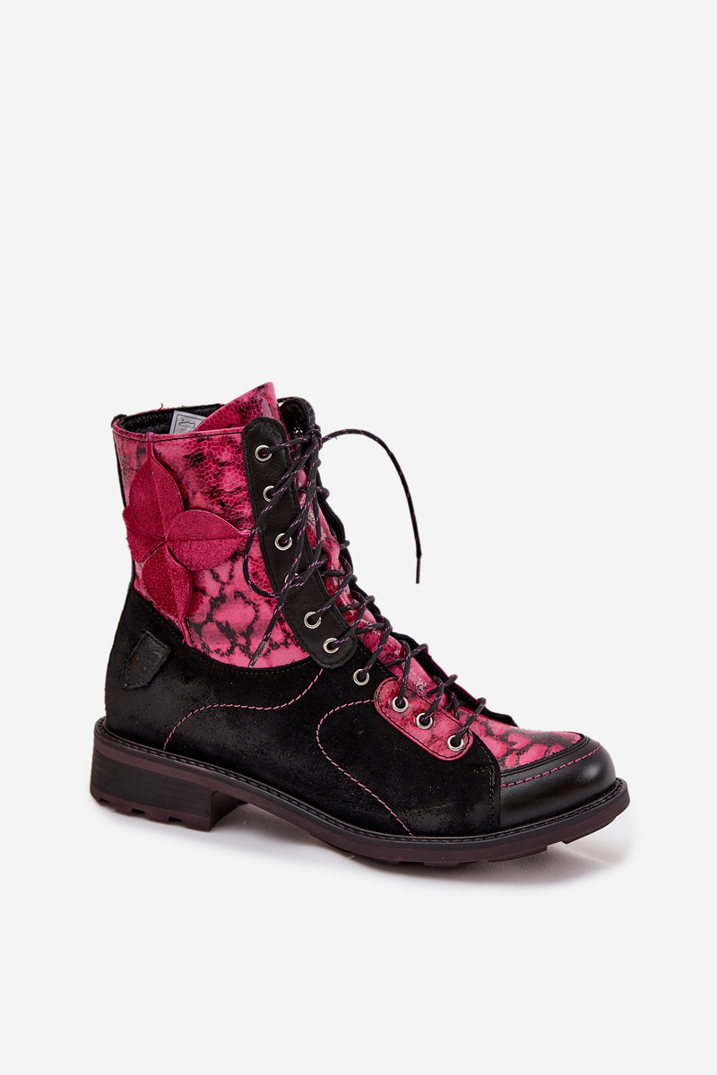 Skórzane Botki Damskie Z Naturalnej Skóry Na Płaskim Obcasie Maciejka 07004-23 Czarno-Różowe