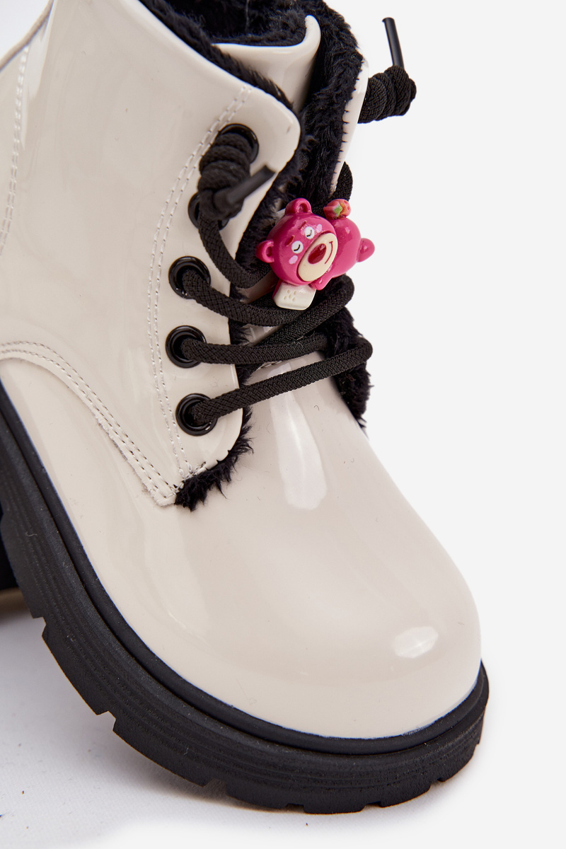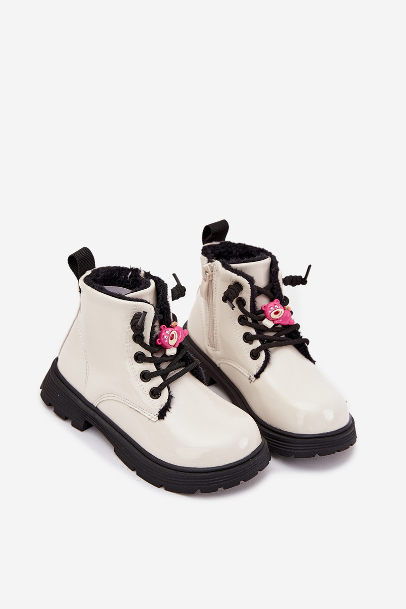 Ocieplane Botki Dziecięce Lakierowane Z Przypinką Miś Białe Jovellea