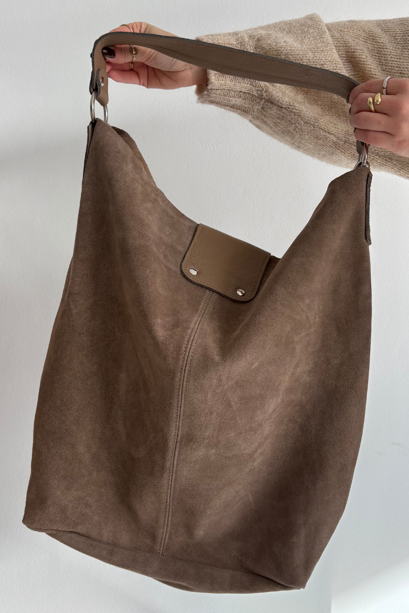 Duża Skórzana Zamszowa Torebka Ciemnobeżowa Hanelle