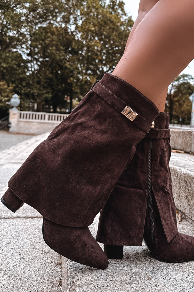 Ocieplane Botki Damskie Na Słupku Z Ozdobnym Paskiem Czekoladowe Luvielle