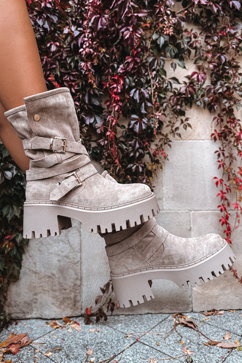 Botki Damskie Na Masywnym Obcasie Z Klamrami I Paskiem Beżowe Nerelisa