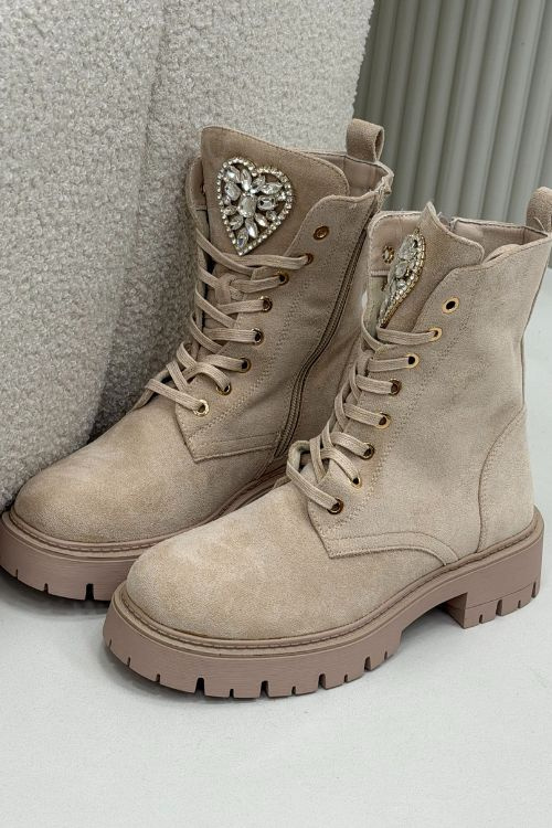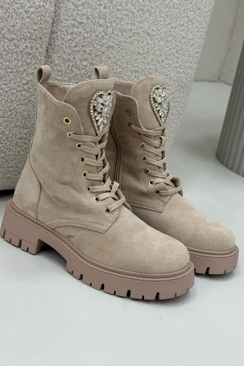 Botki damskie z eko zamszu to urocza propozycja łącząca wygodę z modnym detalem. Model sznurowany i zapinany na zamek zapewnia łatwe zakładanie i idealne dopasowanie do stopy, a ozdobne serce z kryształkami na języku dodaje subtelnego, kobiecego blasku, świetnie uzupełniając codzienne stylizacje. Przy wyborze rozmiaru prosimy sugerować się tabelą rozmiarów.