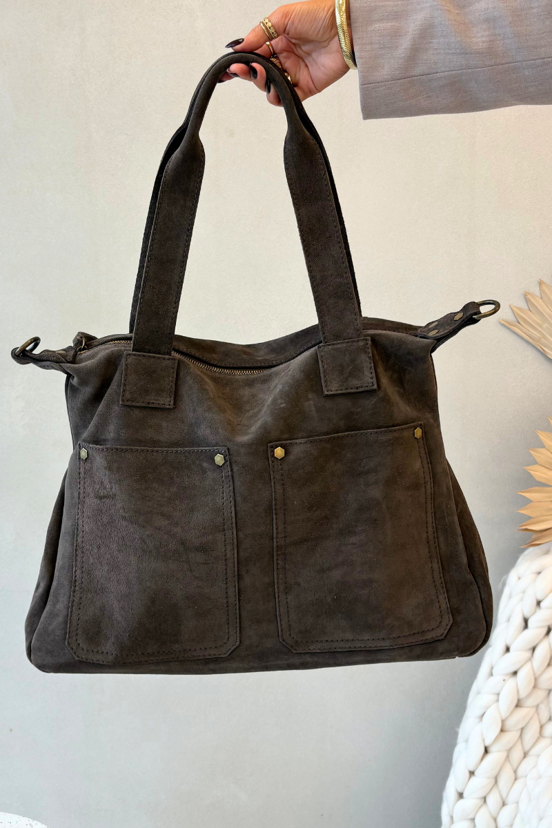 Pojemna torebka damska wykonana z naturalnego zamszu. Model zapinany na zamek zapewnia bezpieczeństwo przechowywanych rzeczy, a liczne kieszenie ułatwiają organizację i porządek wewnątrz. Torebka posiada wygodne uchwyty oraz odpinany, regulowany pasek, dzięki czemu można nosić ją w dłoni lub na ramieniu – w zależności od potrzeb. To stylowy i praktyczny dodatek, który świetnie sprawdzi się zarówno w pracy, jak i na co dzień.