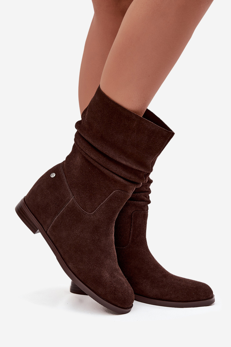 Skórzane Zamszowe Botki Damskie Z Marszczeniem Ocieplane Maciejka K7211-02 Czekoladowe
