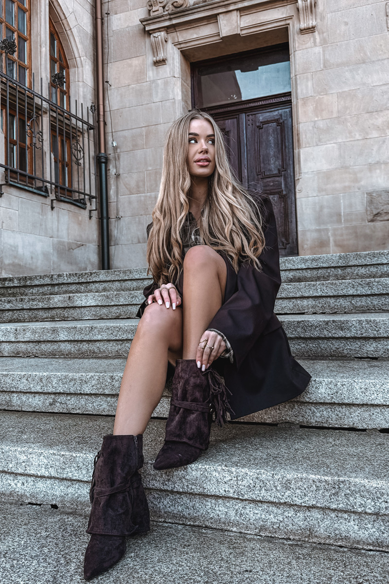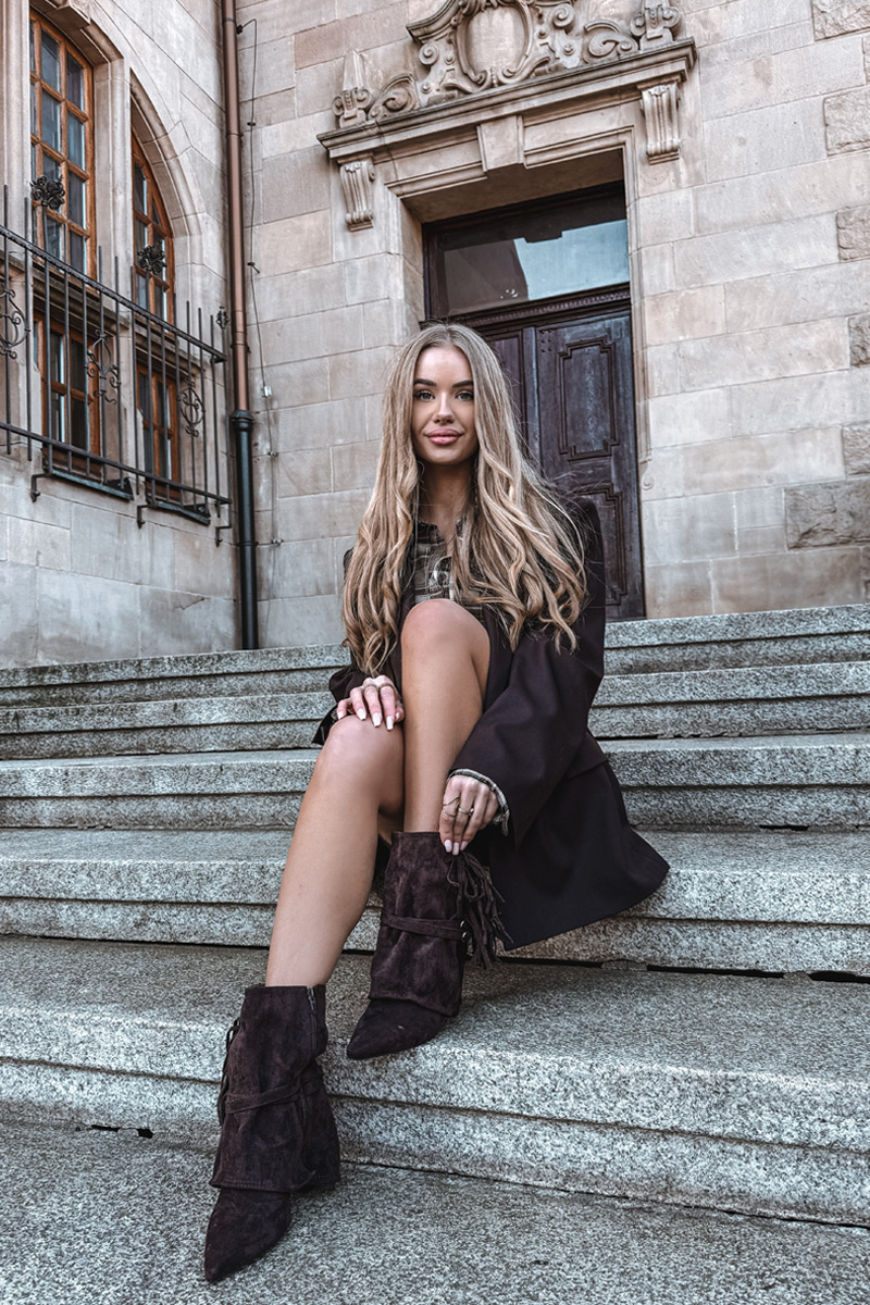 Damskie botki z eko zamszu to idealne połączenie stylu i oryginalnych detali, które przyciągają uwagę. Cholewka nachodząca na obcas subtelnie wysmukla sylwetkę, a szpiczaste noski dodają elegancji i kobiecego charakteru. Model ozdobiony frędzlami oraz cienkimi paseczkami ze złotymi klamrami wprowadza modowy akcent, nadając wyjątkowego, nowoczesnego wyglądu. Botki doskonale sprawdzą się w casualowych zestawach, jak i w bardziej wyjściowych stylizacjach, wprowadzając do nich nutę oryginalności i szyku. Komfortowe i efektowne, stanowią świetny wybór na co dzień i na specjalne okazje.Przy wyborze rozmiaru prosimy sugerować się tabelą rozmiarów.