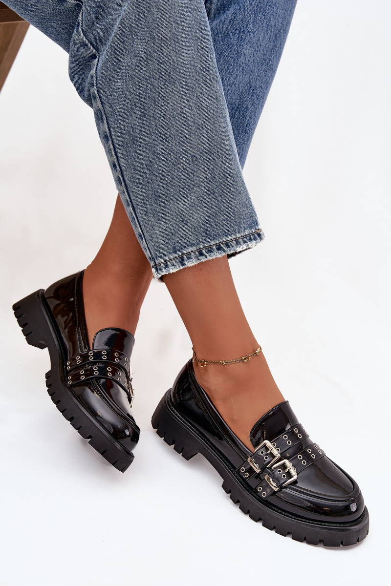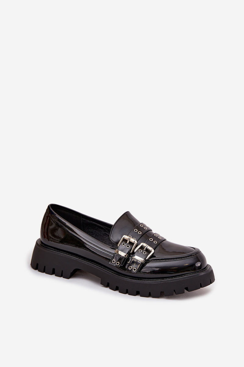 Mokasyny Damskie Lakierowane Z Paskami I Srebrnymi Klamrami Czarne Gabrisse