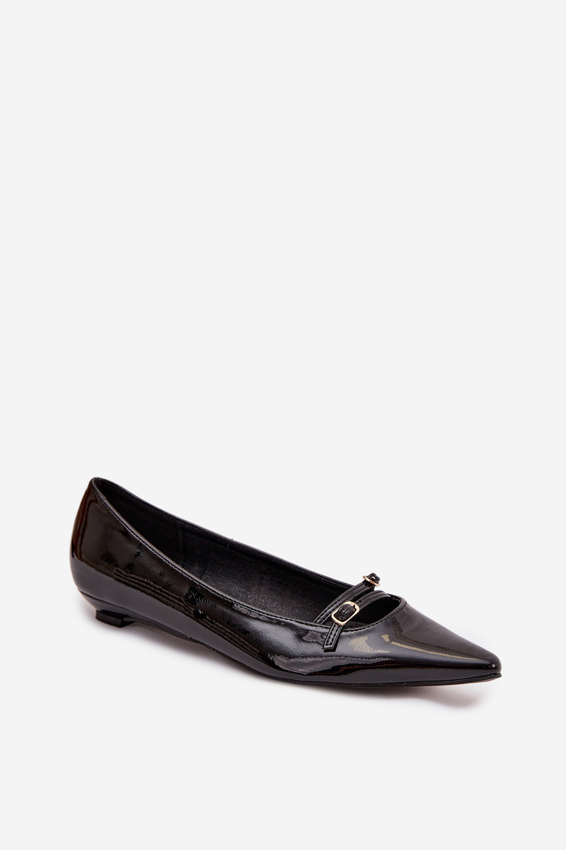 Baleriny wykonane z  lakierowanej eko skóry. Model osadzony na delikatnym obcasie zapewnia subtelne uniesienie i komfort podczas noszenia. Z przodu zdobią go dwa cienkie paseczki ze złotymi sprzączkami, które dodają całości wyjątkowego, eleganckiego charakteru. Szpiczasty nosek optycznie wysmukla stopy, podkreślając ich delikatny kształt. Te baleriny świetnie sprawdzą się zarówno do eleganckich stylizacji biurowych, jak i podczas wieczornych wyjść, gdy chcesz wyglądać stylowo i czuć się komfortowo przez cały dzień. Podczas wyboru rozmiaru prosimy sugerować się tabelą rozmiarów.