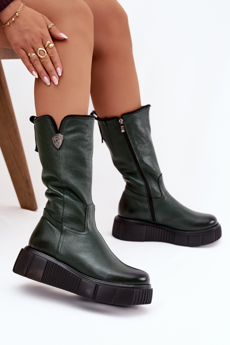 Zazoo 70121 Skórzane Damskie Kozaki Z Wełną Oliwkowe