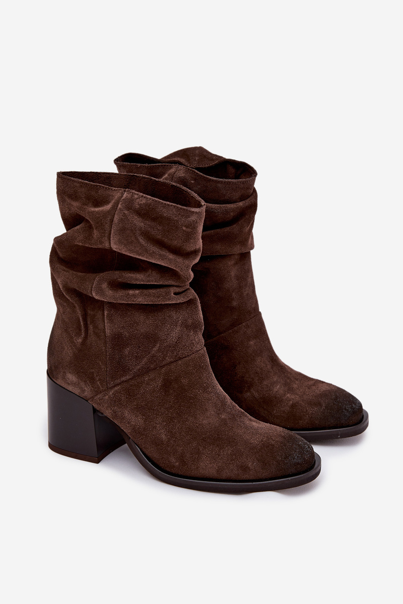 Skórzane Zamszowe Botki Z Marszczeniem Na Słupku Zazoo 1127 Czekoladowe