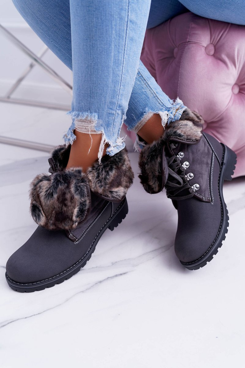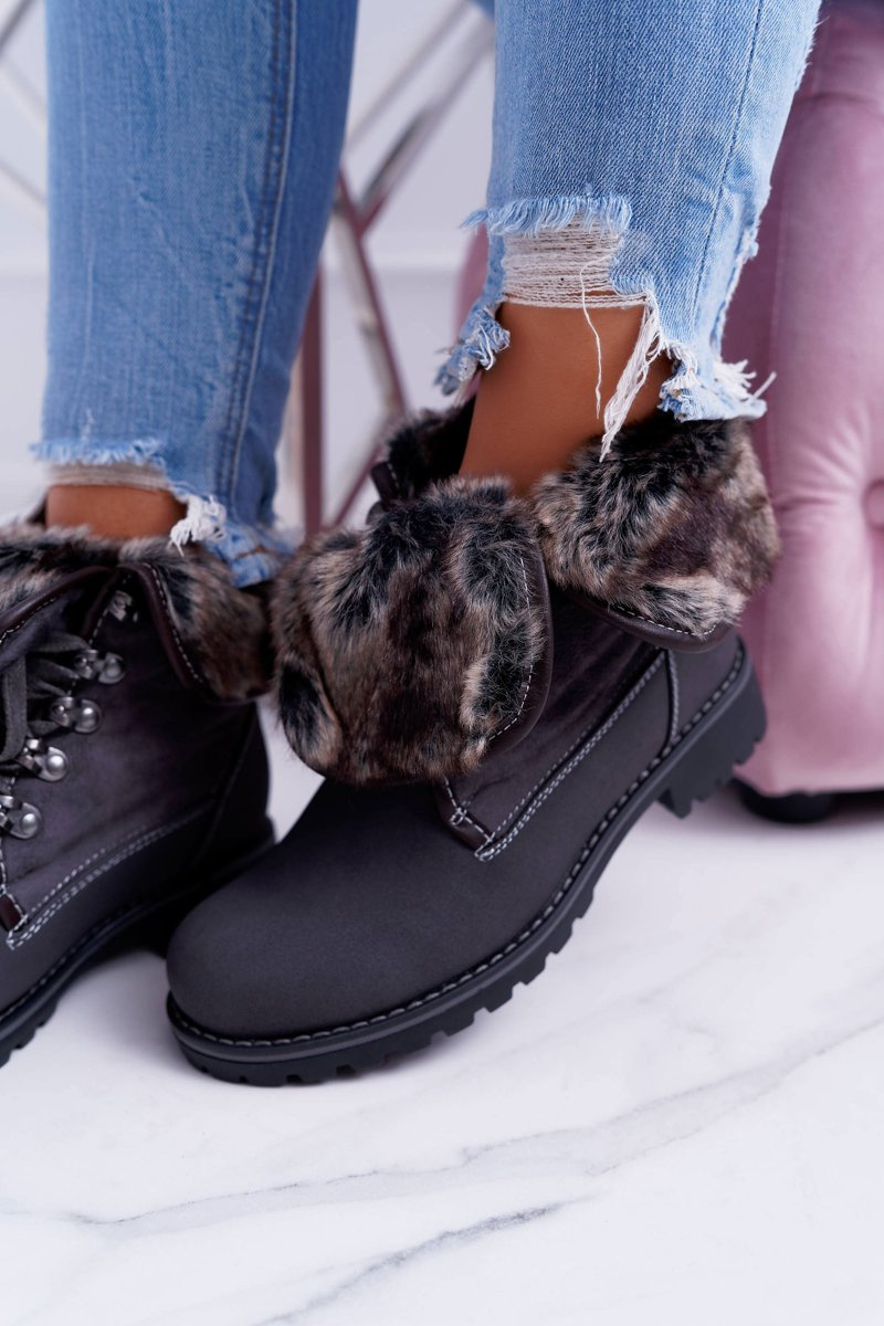 Damskie Szare Botki Trapery z Futerkiem Chester