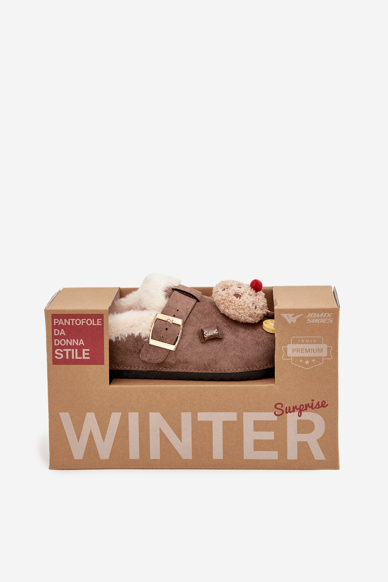 Kapcie Damskie Z Ozdobami I Klamrą Ocieplane Futerkiem Brązowe Thalora