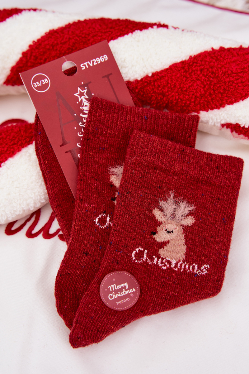 Skarpetki Damskie Świąteczne Z Reniferem Wełna Alpaka Czerwone