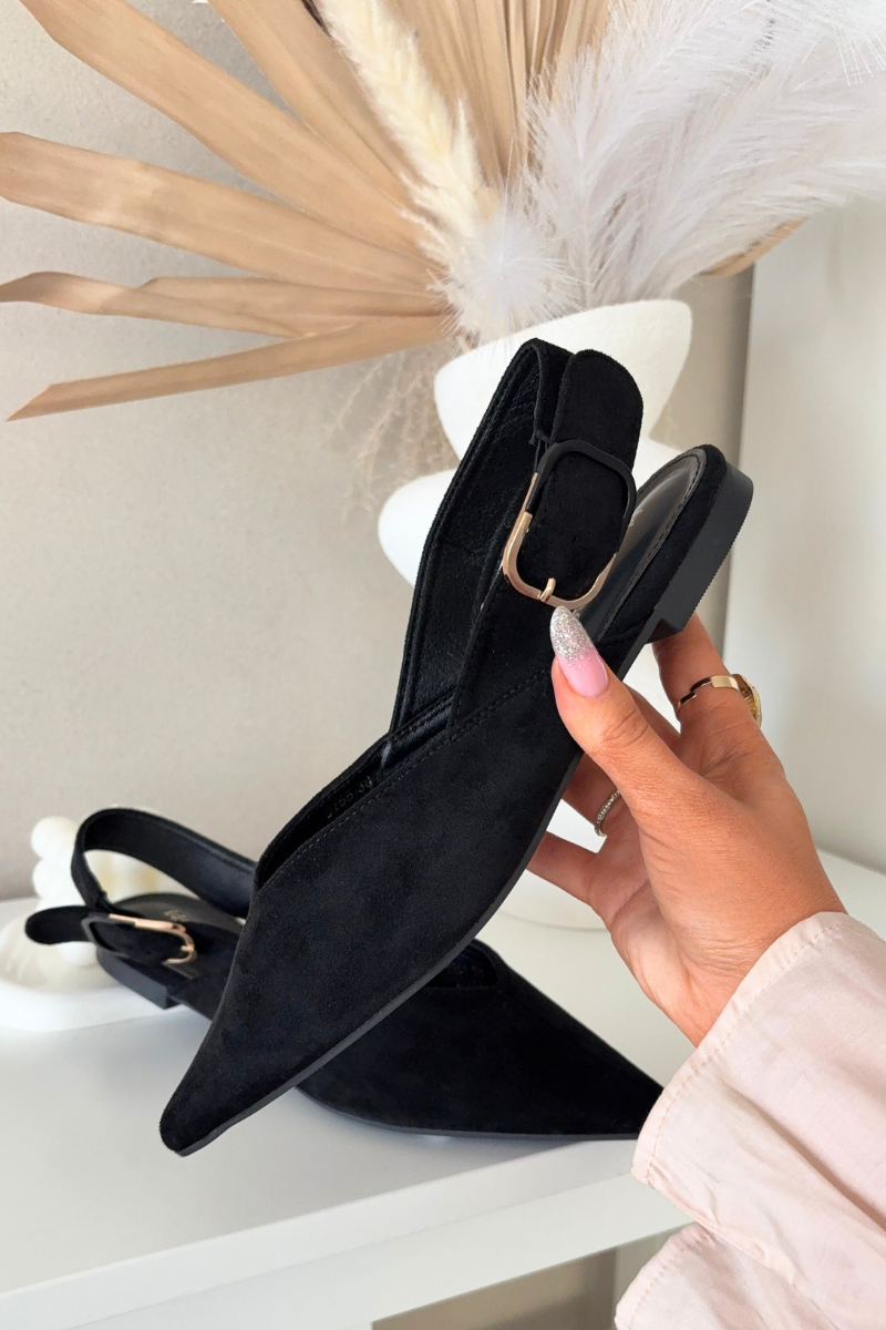 Baleriny damskie wykonane z eko zamszu to stylowy i wygodny wybór na co dzień. Model na płaskim obcasie gwarantuje komfort, a szpiczaste noski dodają elegancji i subtelnie wysmuklają stopę. Z tyłu znajduje się regulowany pasek zakończony dużą, dekoracyjną klamrą, która przyciąga uwagę i stanowi modny akcent. To baleriny idealne do kobiecych, nowoczesnych stylizacji.