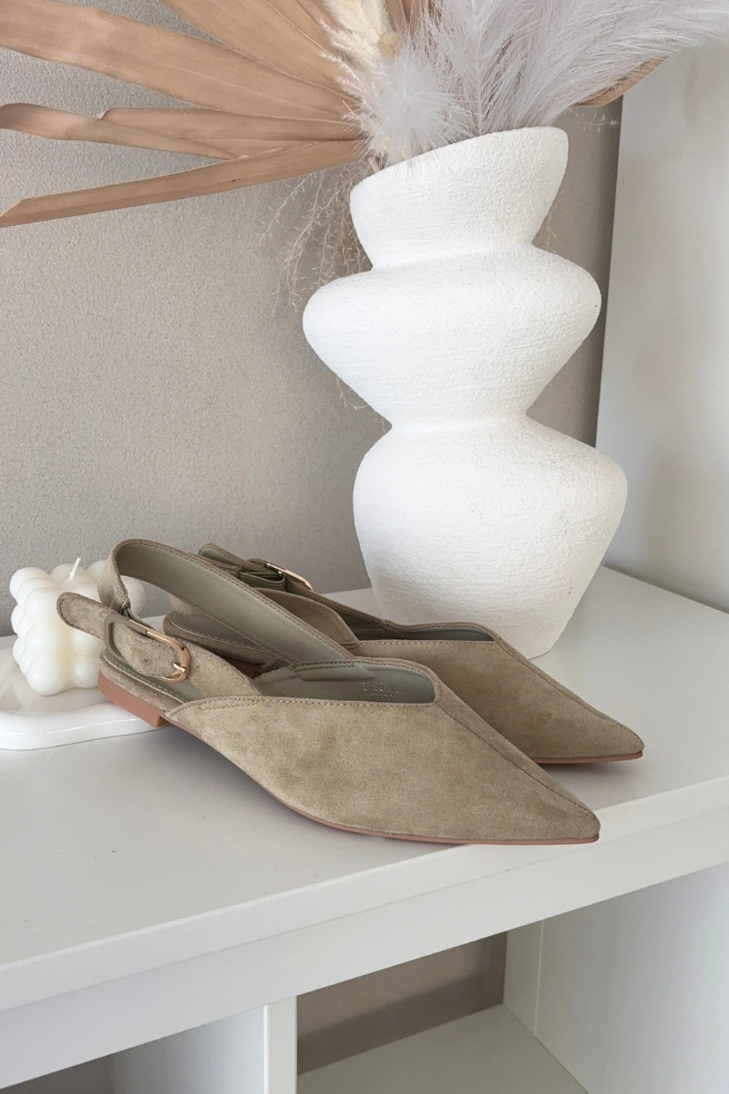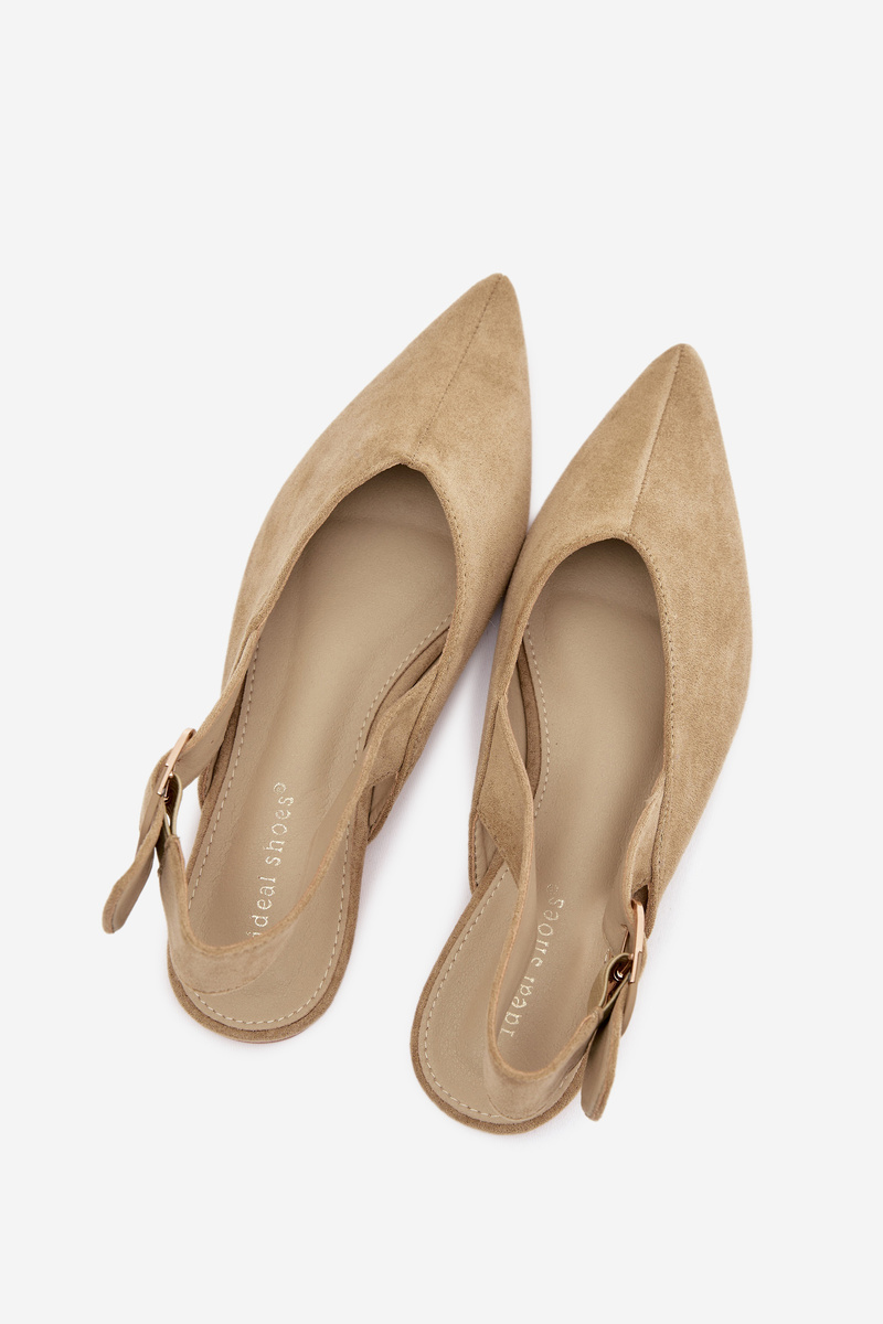 Baleriny damskie wykonane z eko zamszu to stylowy i wygodny wybór na co dzień. Model na płaskim obcasie gwarantuje komfort, a szpiczaste noski dodają elegancji i subtelnie wysmuklają stopę. Z tyłu znajduje się regulowany pasek zakończony dużą, dekoracyjną klamrą, która przyciąga uwagę i stanowi modny akcent. To baleriny idealne do kobiecych, nowoczesnych stylizacji.