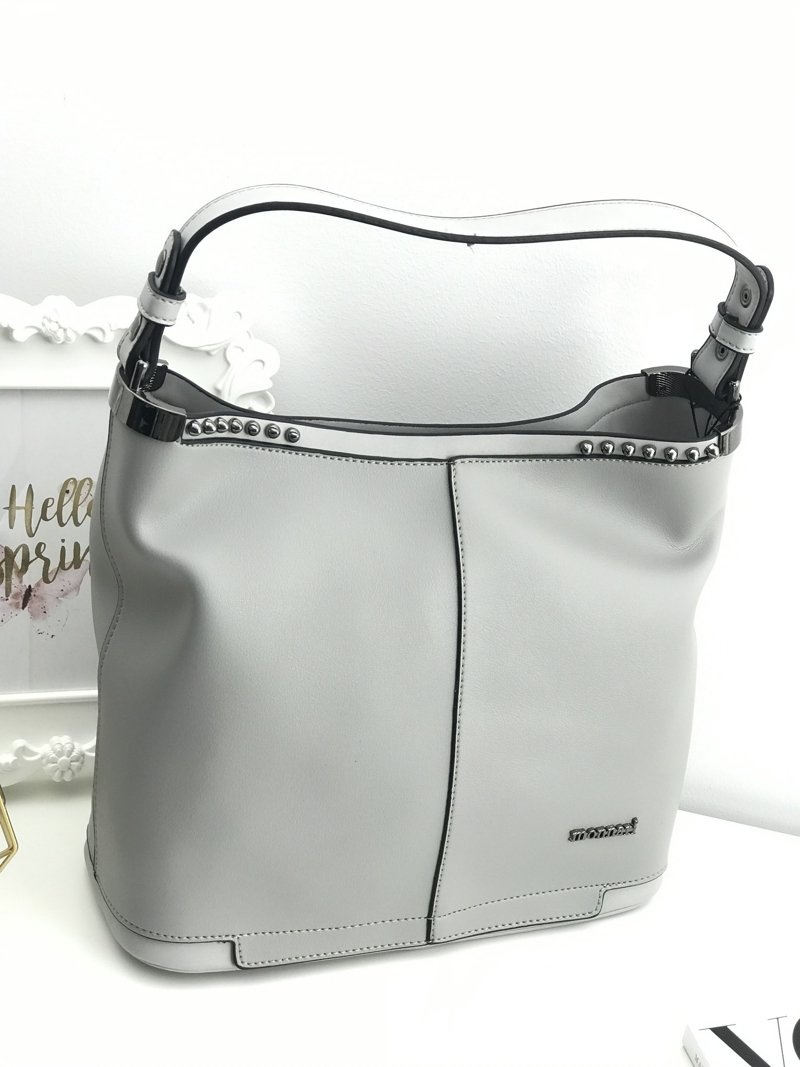 Wykonana z ekoskóry torba damska typu shopperka, średniej wielkości, mieszcząca A4. Torebka zdobiona połyskującymi ćwiekami i metalowymi okuciami. Wnętrze torby z jasną podszewką, otwartymi przegródkami i kieszenią na dokumenty. Z tyłu torby kieszonka na telefon. Polecamy ten model jako dodatek do miejskiej stylizacji.