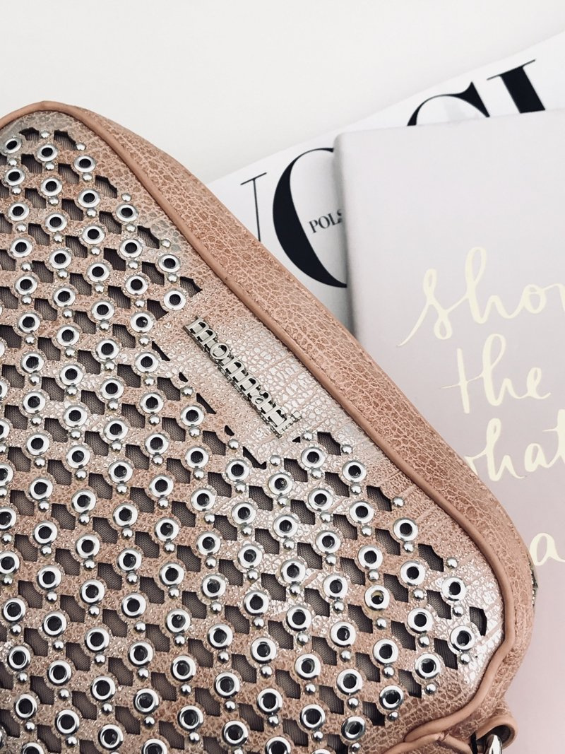 Wykonana z ekoskóry torba damska, nie mieszcząca A4. Torebka zdobiona połyskującymi nitami i okuciami w kolorze srebrnym. Wnętrze torby z jasną podszewką, zapinana na suwak. Długi regulowany pasek na ramię. Polecamy ten model jako dodatek do miejskiej stylizacji.