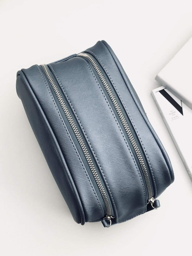 Wykonana z ekoskóry damska kosmetyczka, która może być również saszetką. Małe torebki typu saszetki czy kosmetyczki to w nadchodzącym sezonie hit! Zdobiona połyskującymi okuciami w kolorze srebrnym. Wnętrze torby z jasną podszewką, zapinana na dwa suwaki i magnes, dzięki czemu mamy wygodny dostęp do zawartości. Polecamy ten model jako dodatek do miejskich stylizacji oraz jako niezbędnik każdej kobiety.