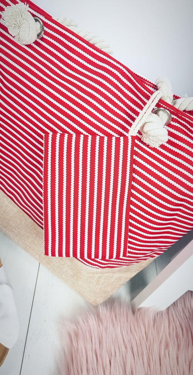 Plażowa Duża Torebka Torba Damska Czerwone Paski
