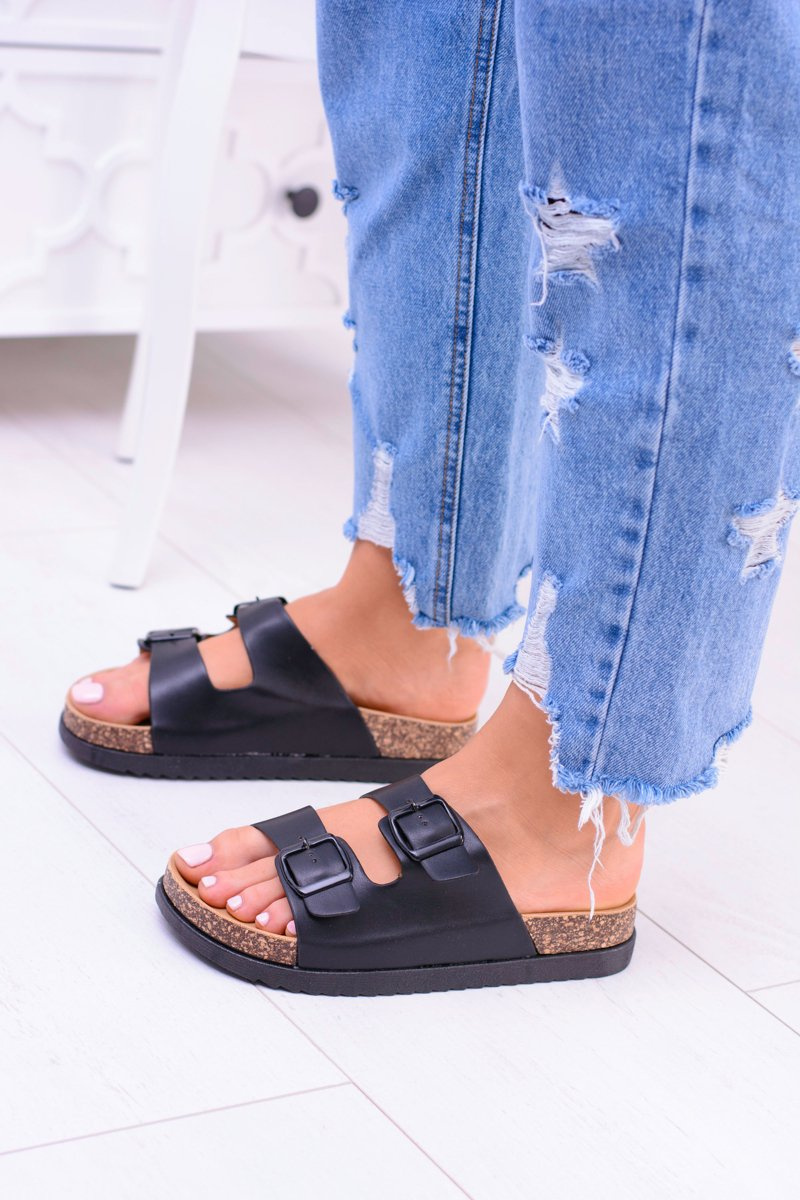 Damskie Czarne Klapki Z Klamrami Na Korku Ferone