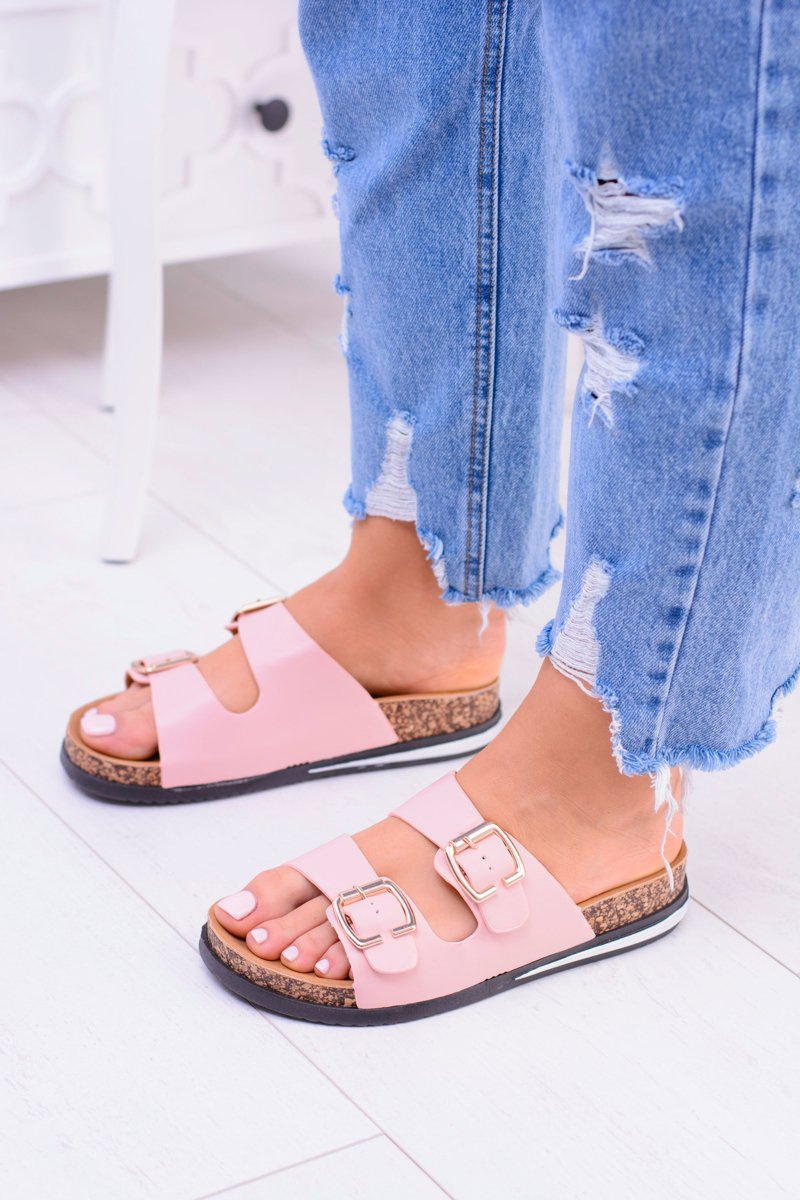 Damskie Różowe Klapki Z Klamrami Na Korku Ferone