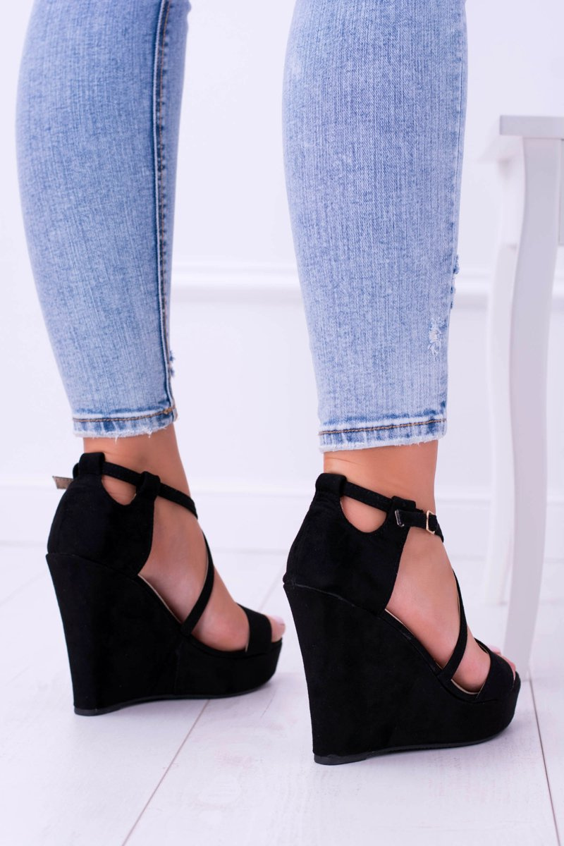 Damskie Czarne Zamszowe Sandały Na Koturnie Eline