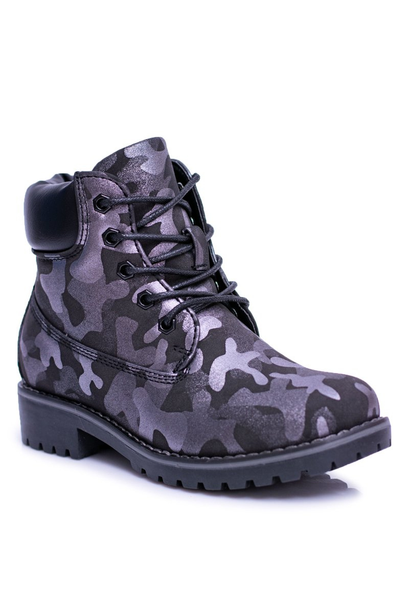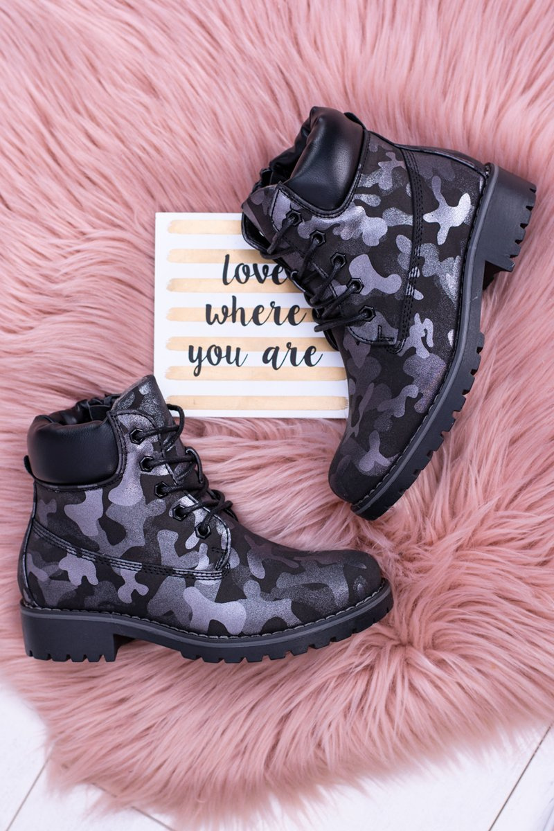 Podczas chłodnych dni warto zadbać o ciepłe buty dla naszych najmłodszych. Modne traperki w czarnym kolorze oraz motywem moro będą pasować do każdego stylu. Wnętrze ocieplone miłym w dotyku "misiem" który zagwarantuje komfort na każdym kroku nawet w najmroźniejsze dni. Łatwe zakładanie dzięki wszytemu na boku suwakowi. Model dostępny również w wersji szarej w rozmiarówce dziecięcej jak i młodzieżowej. Koniecznie sprawdź całą naszą ofertę dziecięcych i młodzieżowych botków.