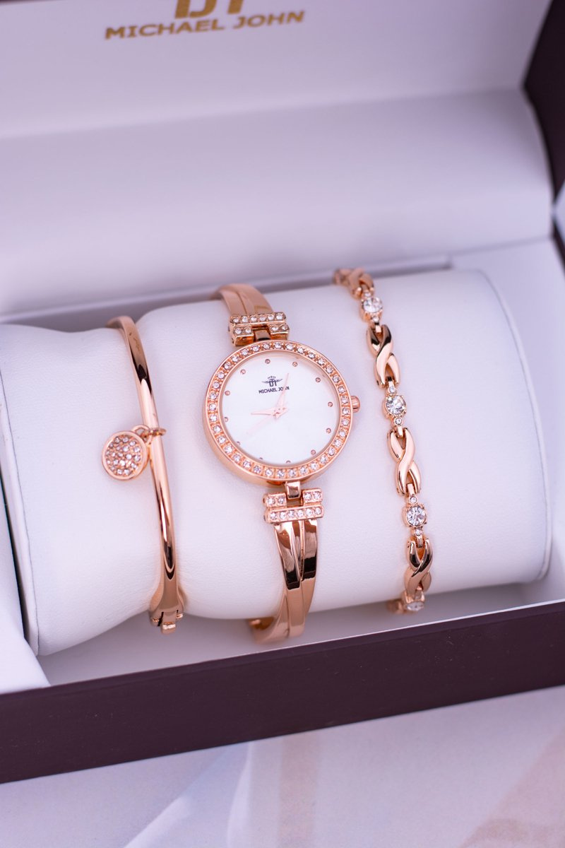 Zestaw Michael John Damski Zegarek Z Cyrkoniami Dwie Bransolety Różowe Złoto