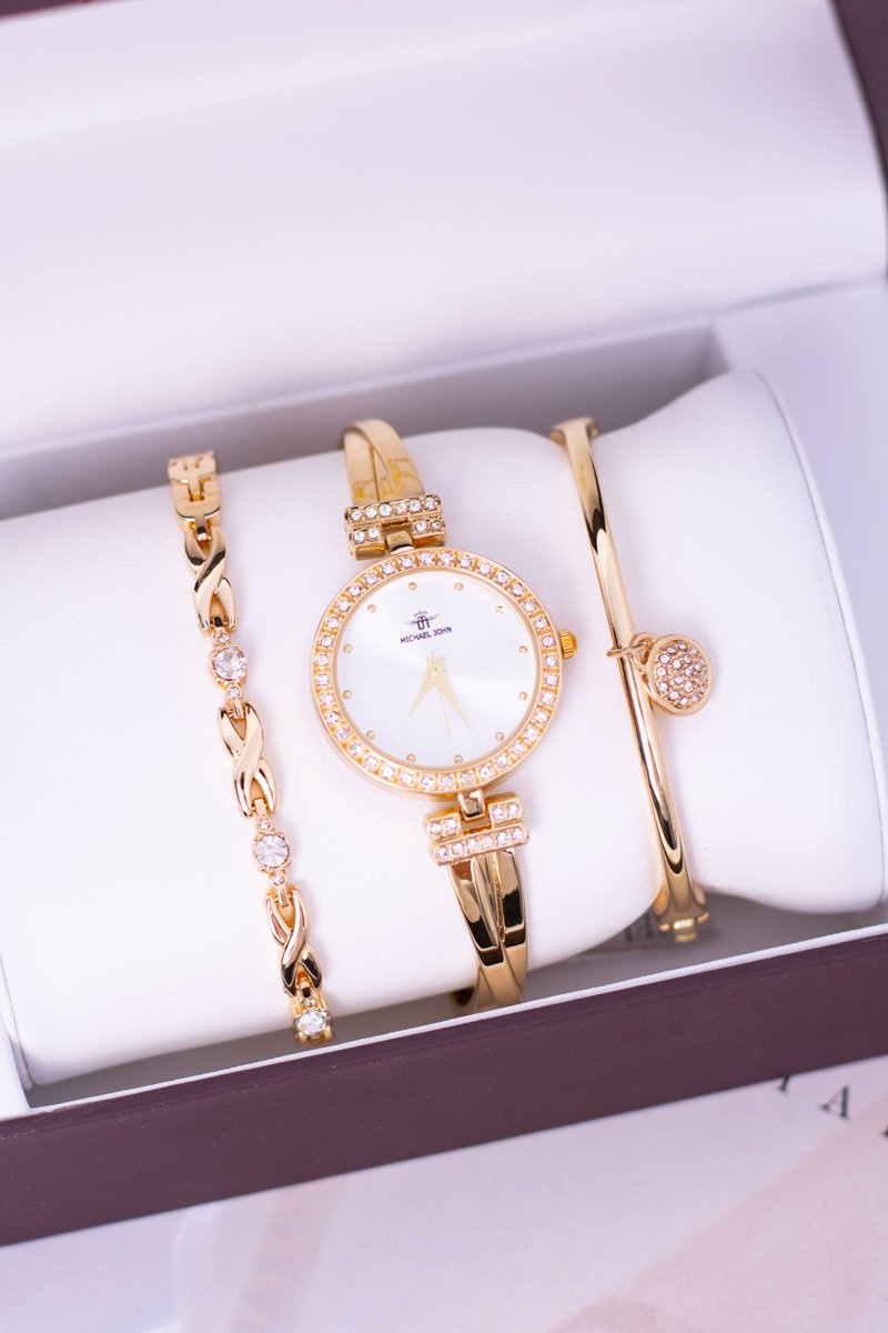 Zestaw Michael John Złoty Damski Zegarek Z Cyrkoniami Dwie Bransolety