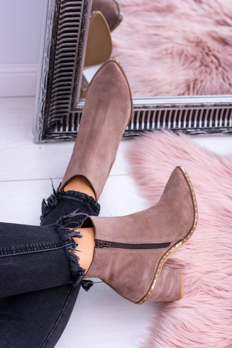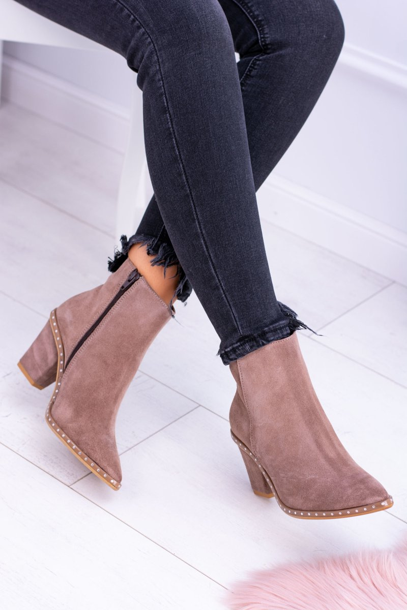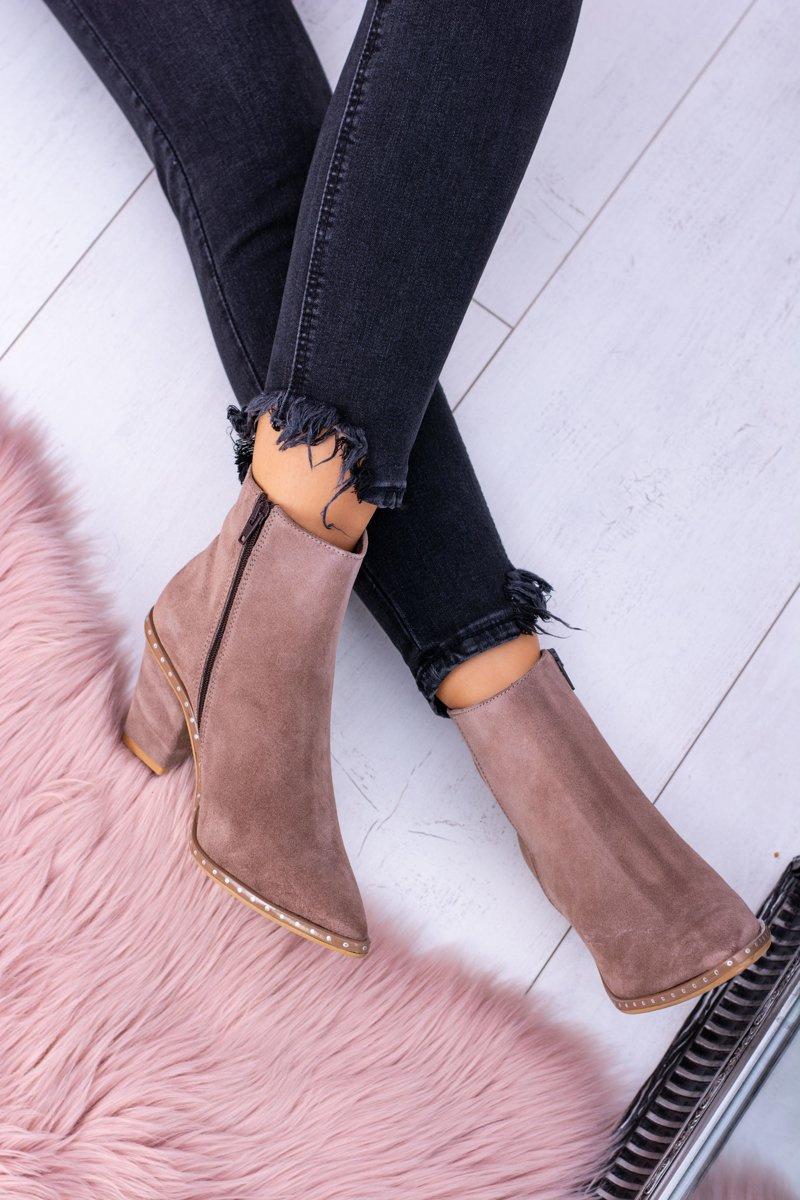 Skórzane Zamszowe Beżowe Damskie Botki W Szpic Z Suwakiem Sonoma