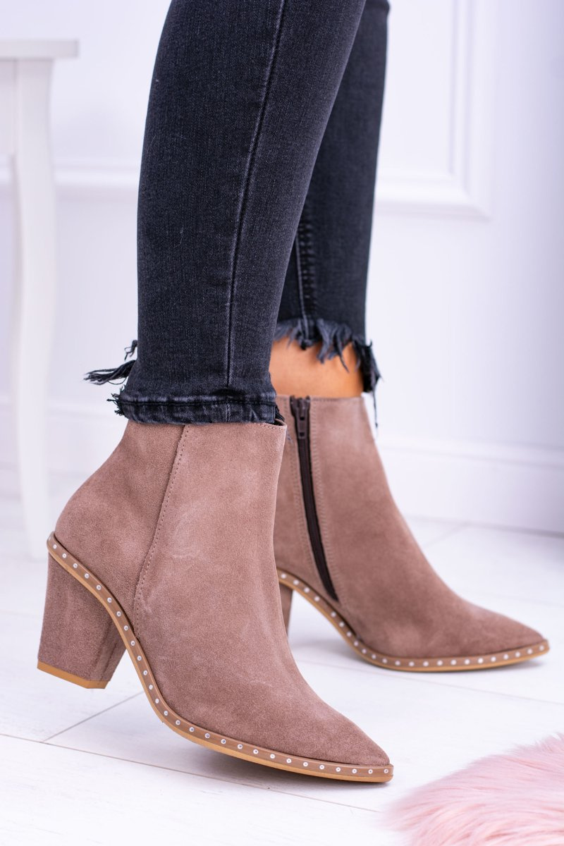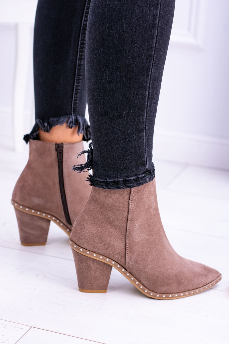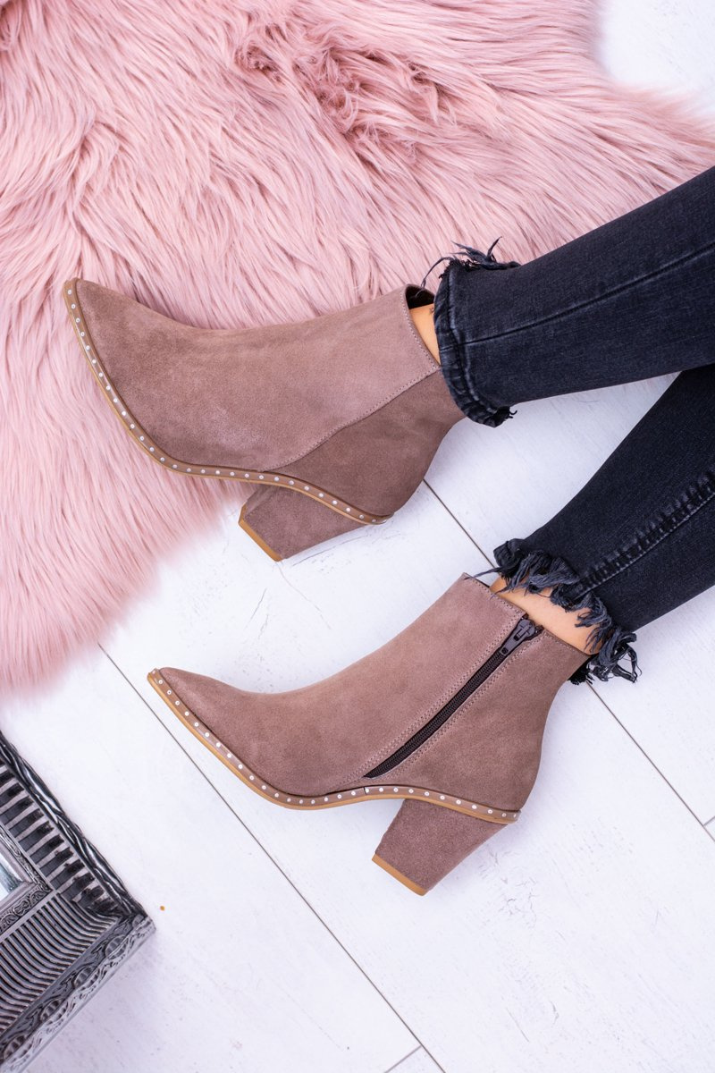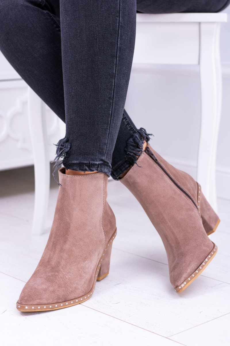 Skórzane Zamszowe Beżowe Damskie Botki W Szpic Z Suwakiem Sonoma