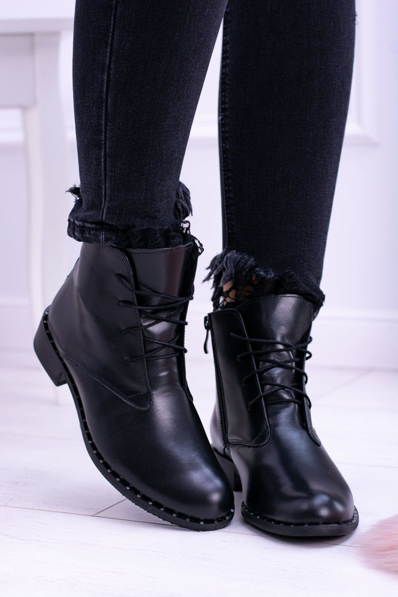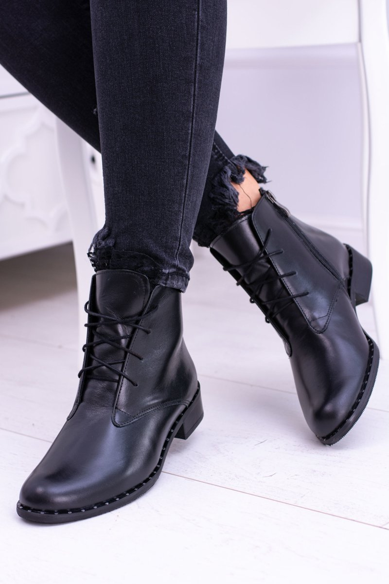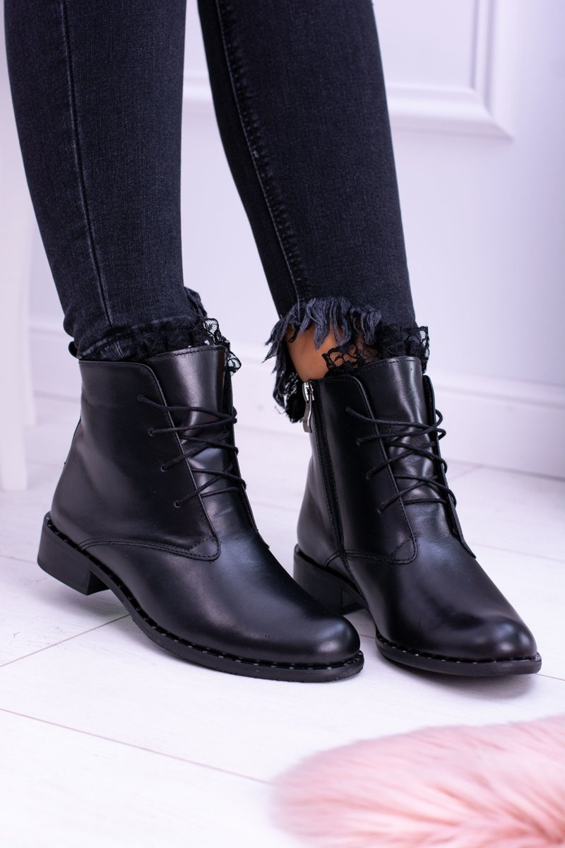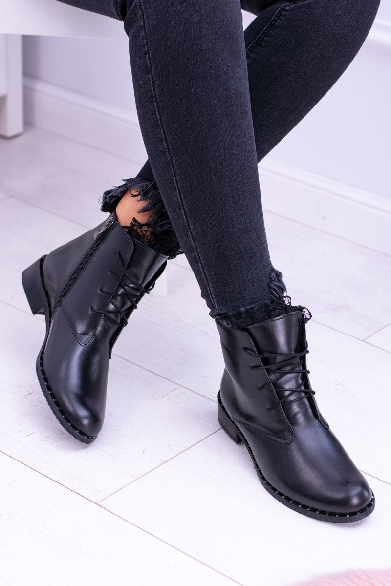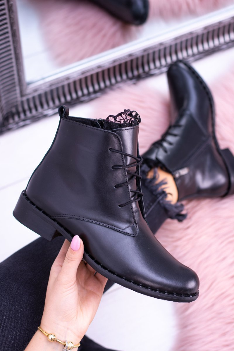 Ocieplane Skórzane Czarne Damskie Botki Z Koronką Millano