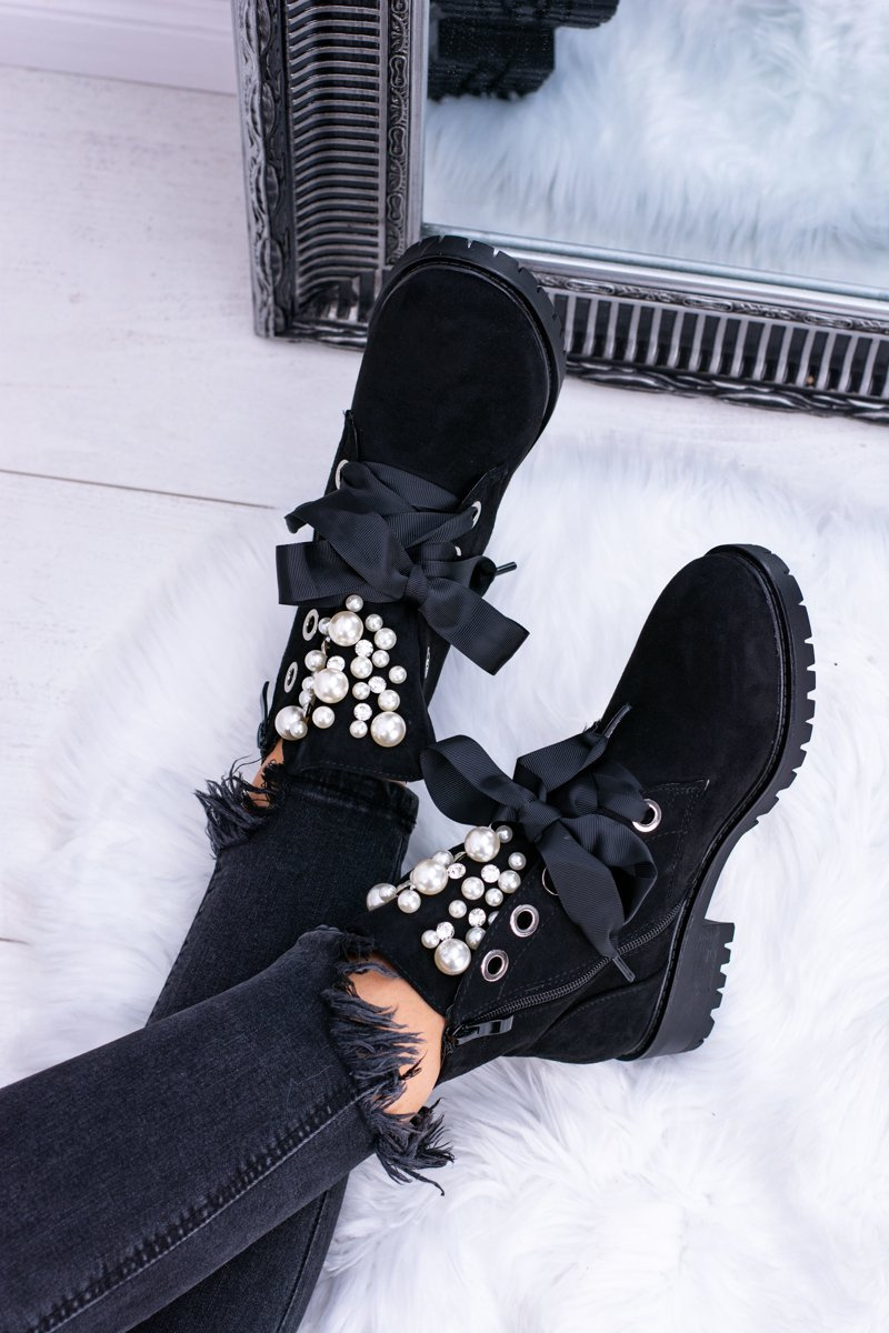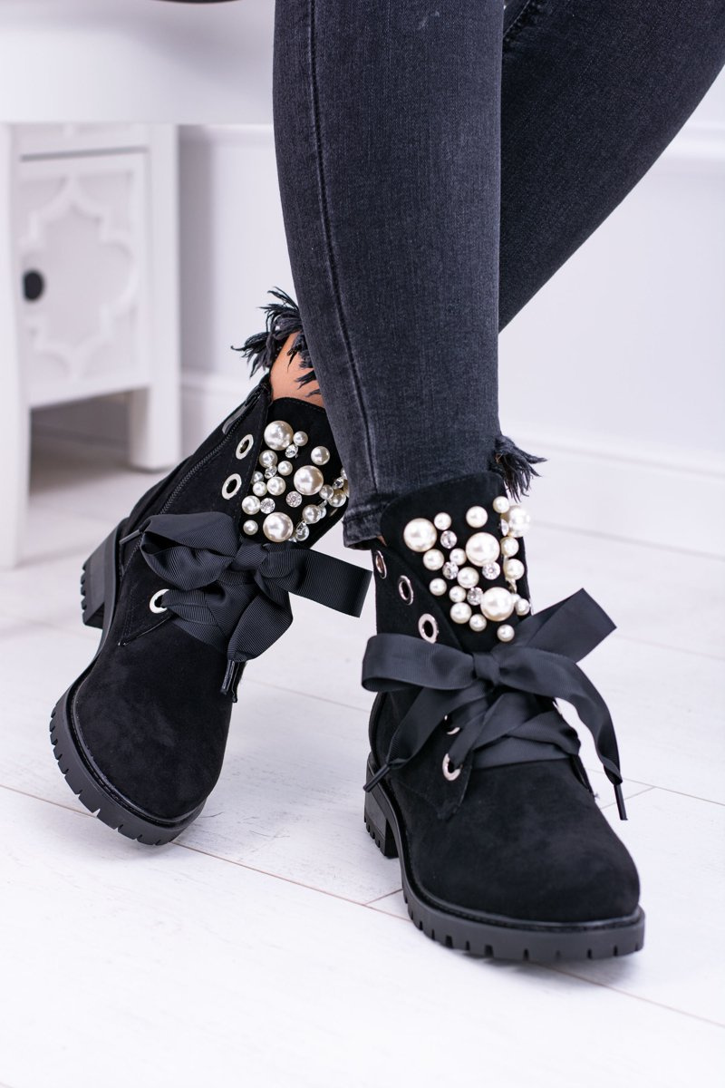 Zamszowe Ocieplane Botki Z Perełkami I Wstążką Czarne Perla