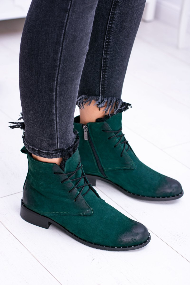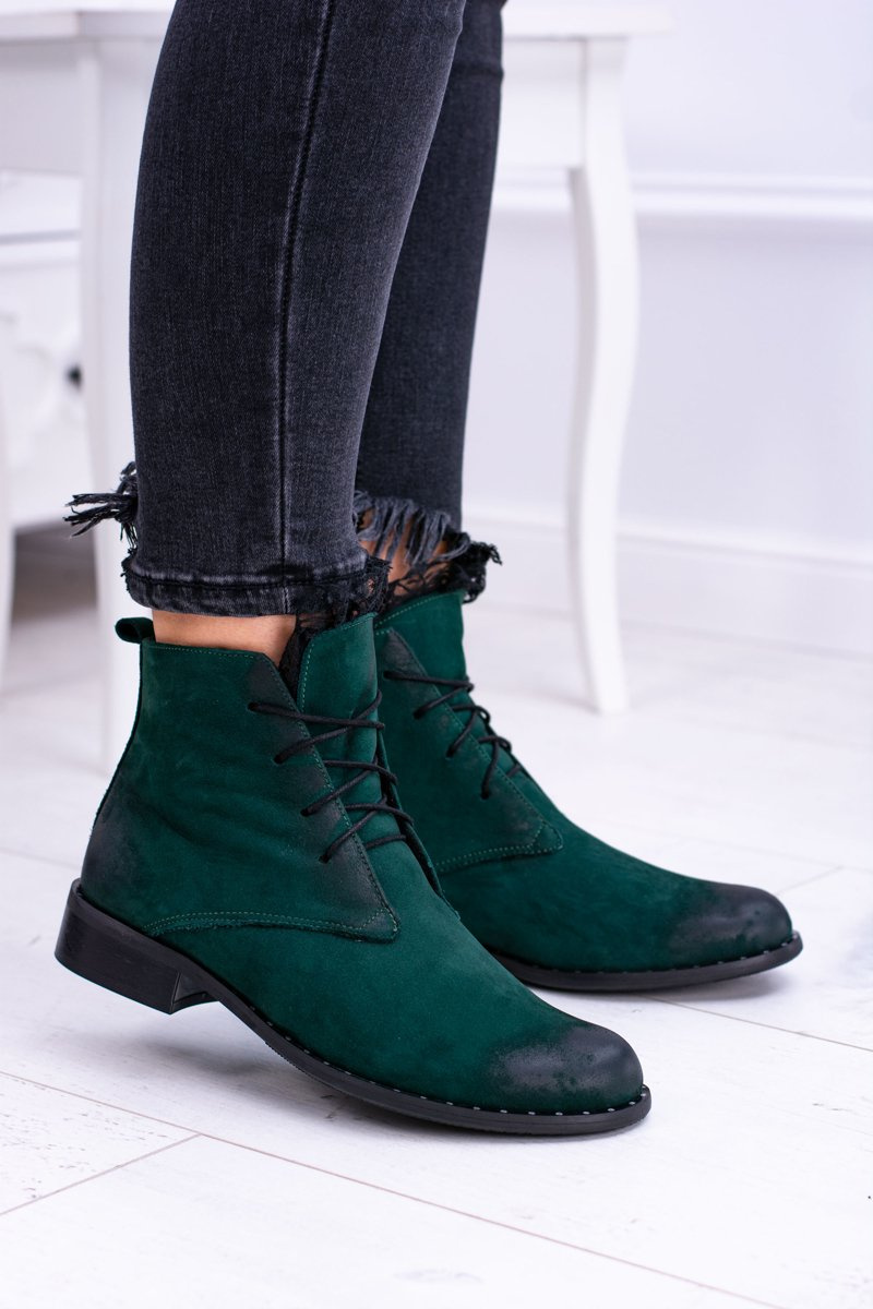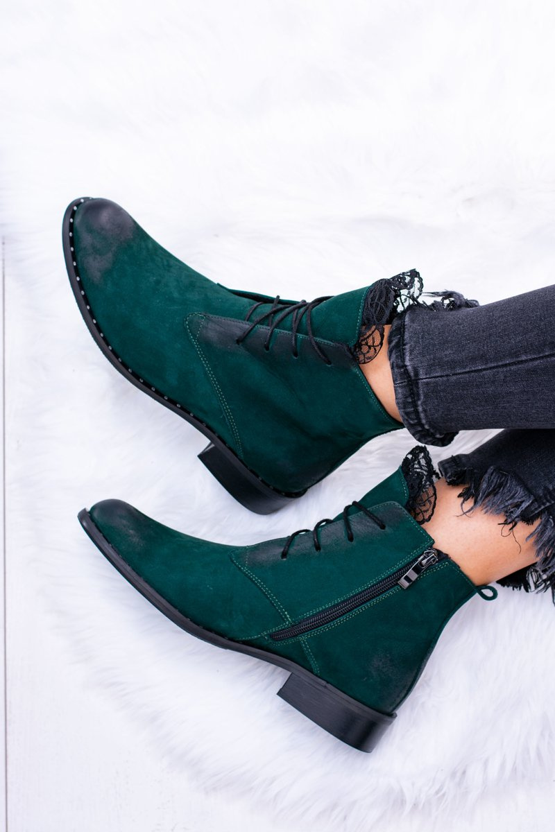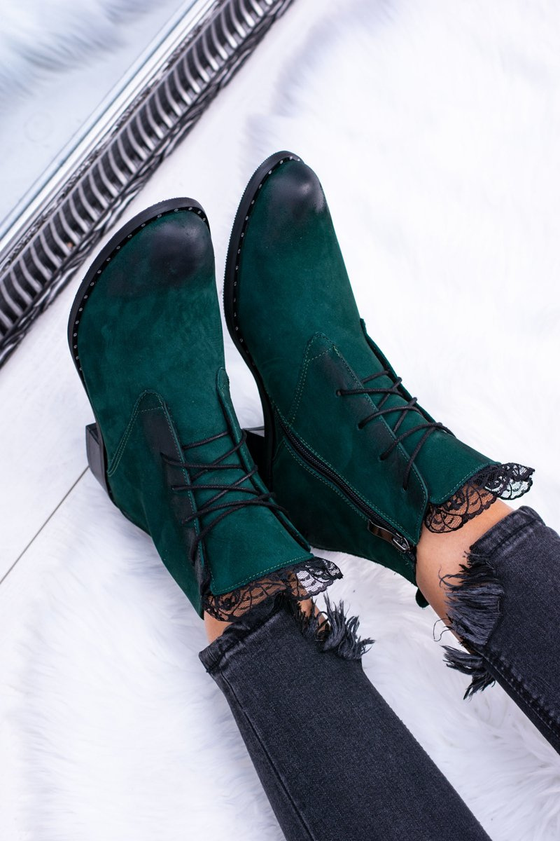 Skórzane Zielone Damskie Botki Z Koronką Millano
