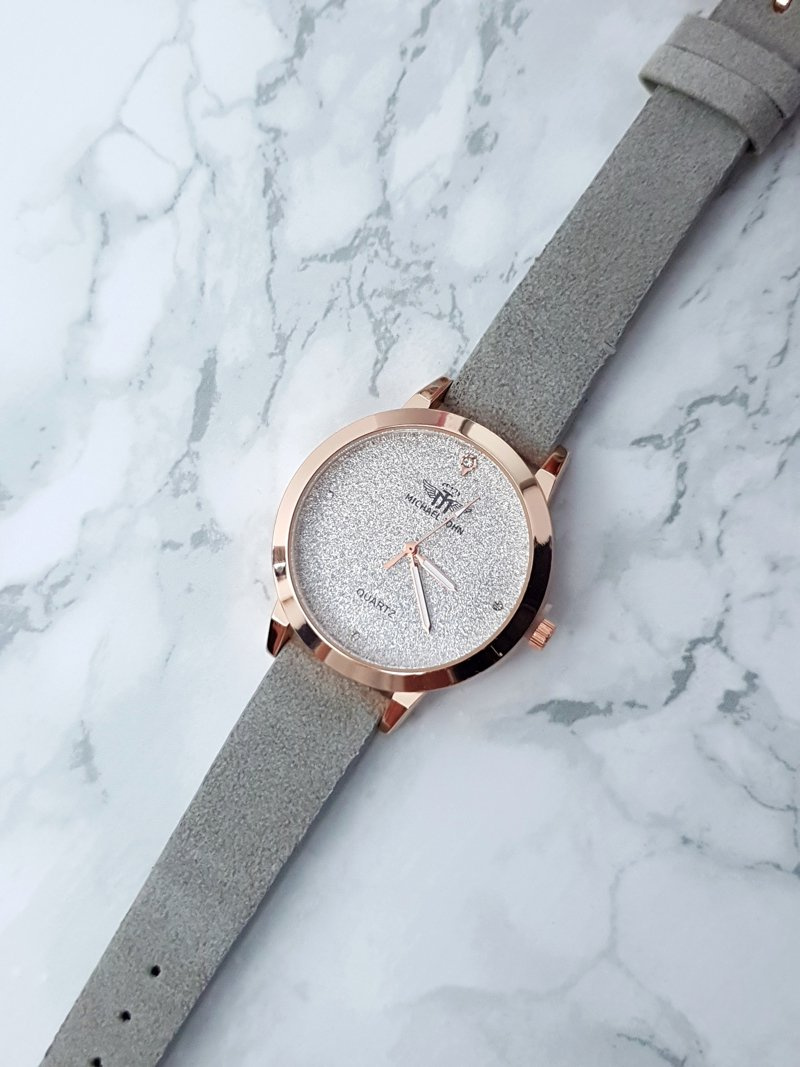Damski Zegarek Michael John Evento Szary Zamszowy Pasek Brokat