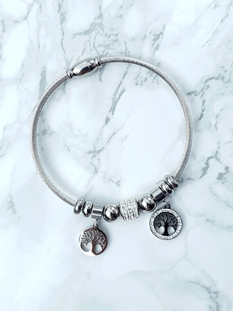 Damska Bransoleta Na Stalowej Lince Ze Srebrnymi Zawieszkami Charms