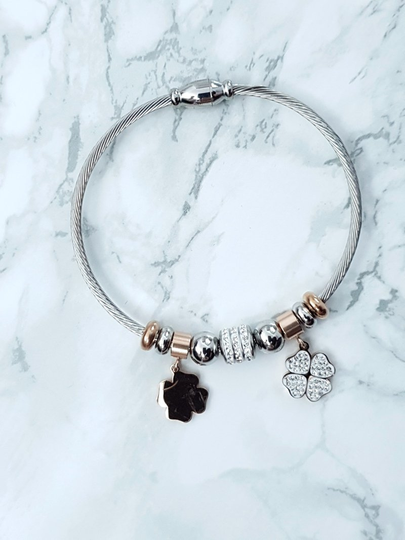 My kobiety kochamy błyskotki. Każda stylizacja potrzebuje dodatków, a nawet te najmniejsze są bardzo ważne. Mowa tu o pięknej biżuterii, która podkreśli to co najlepsze. Delikatna bransoletka ze stalowej linki z pięknie mieniącymi się zawieszkami w różnych kształtach oraz wzorach. Bransoletka posiada zapinanie na magnes, które ułatwi jej zakładanie. Sprawdź całą naszą kolekcję biżuterii i wybierz swój ulubiony dodatek.