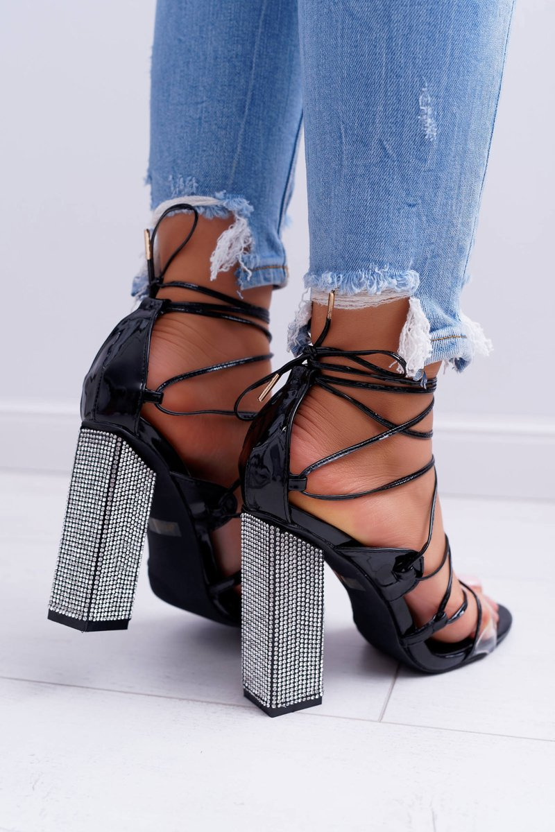 Sandały Damskie Na Słupku Z Cyrkoniami Wiązane Czarne Everything