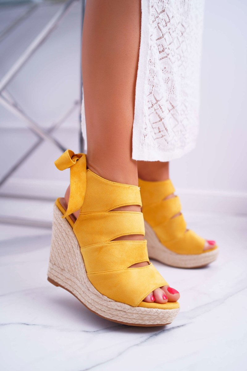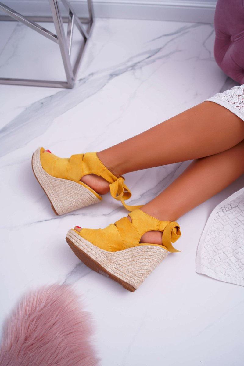 Sandały Damskie Na Koturnie Lniane Wiązane Żółte Cantare