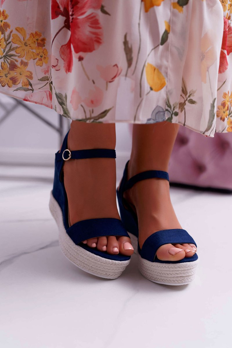 Sandały Damskie Na Koturnie Lniane Granatowe Liviana
