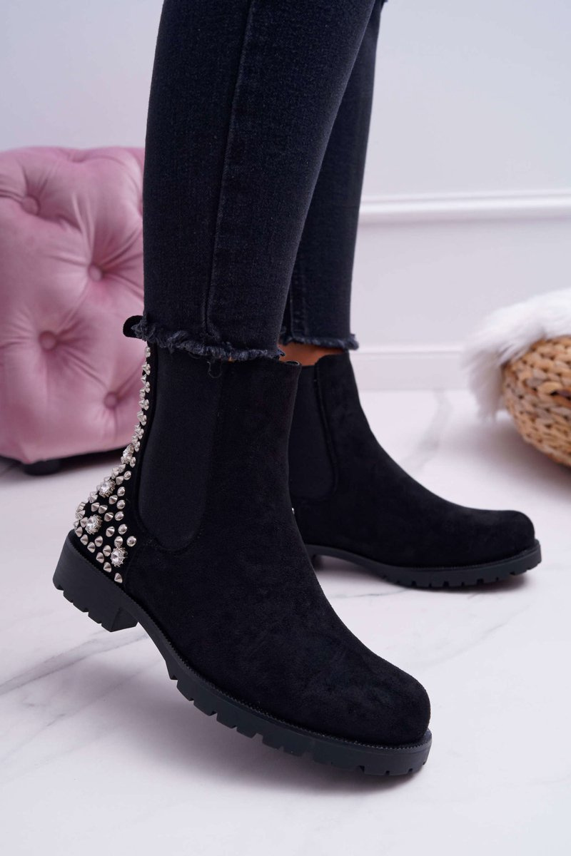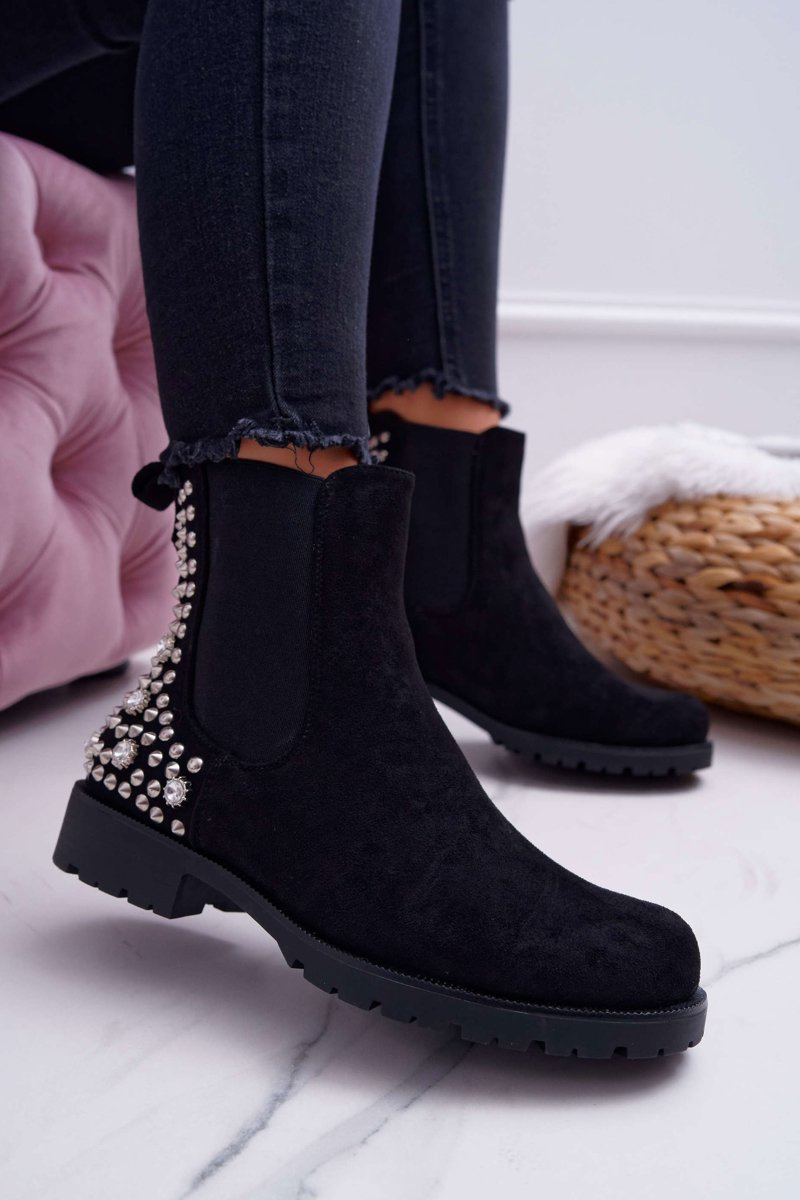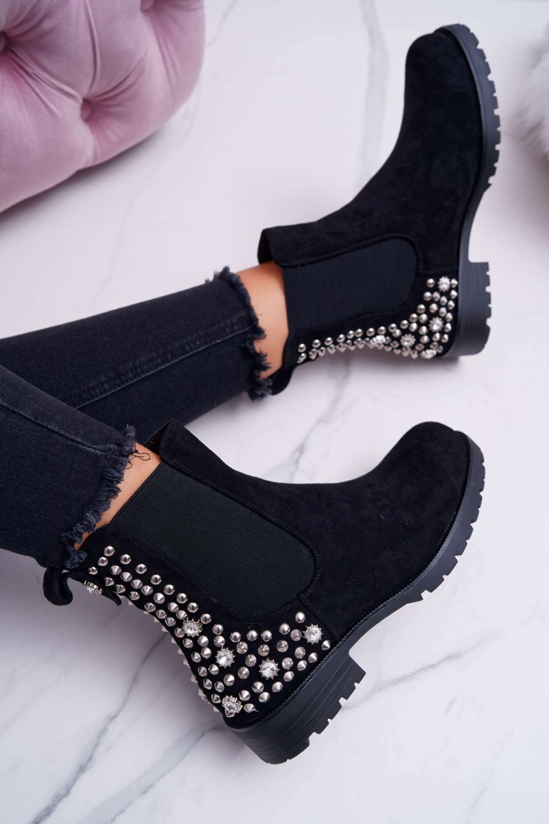 Botki Damskie Płaski Obcas Dżety Ćwieki Czarne Binary