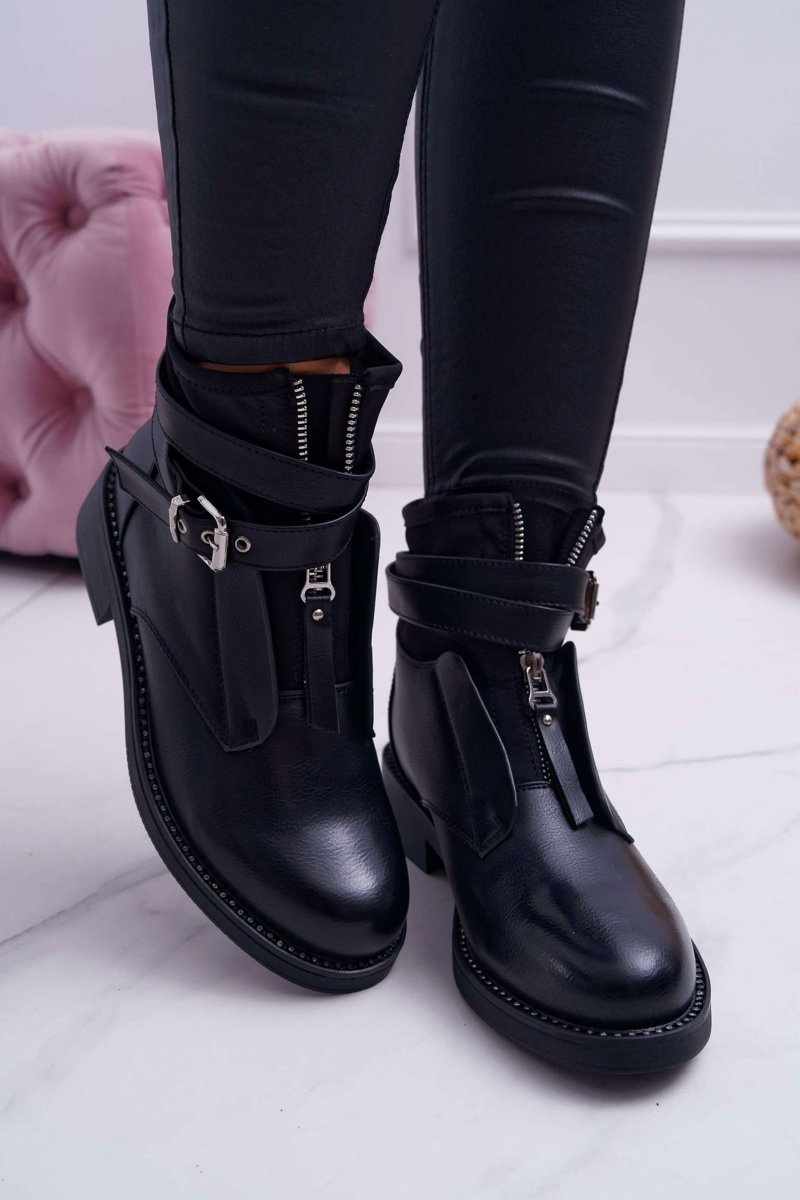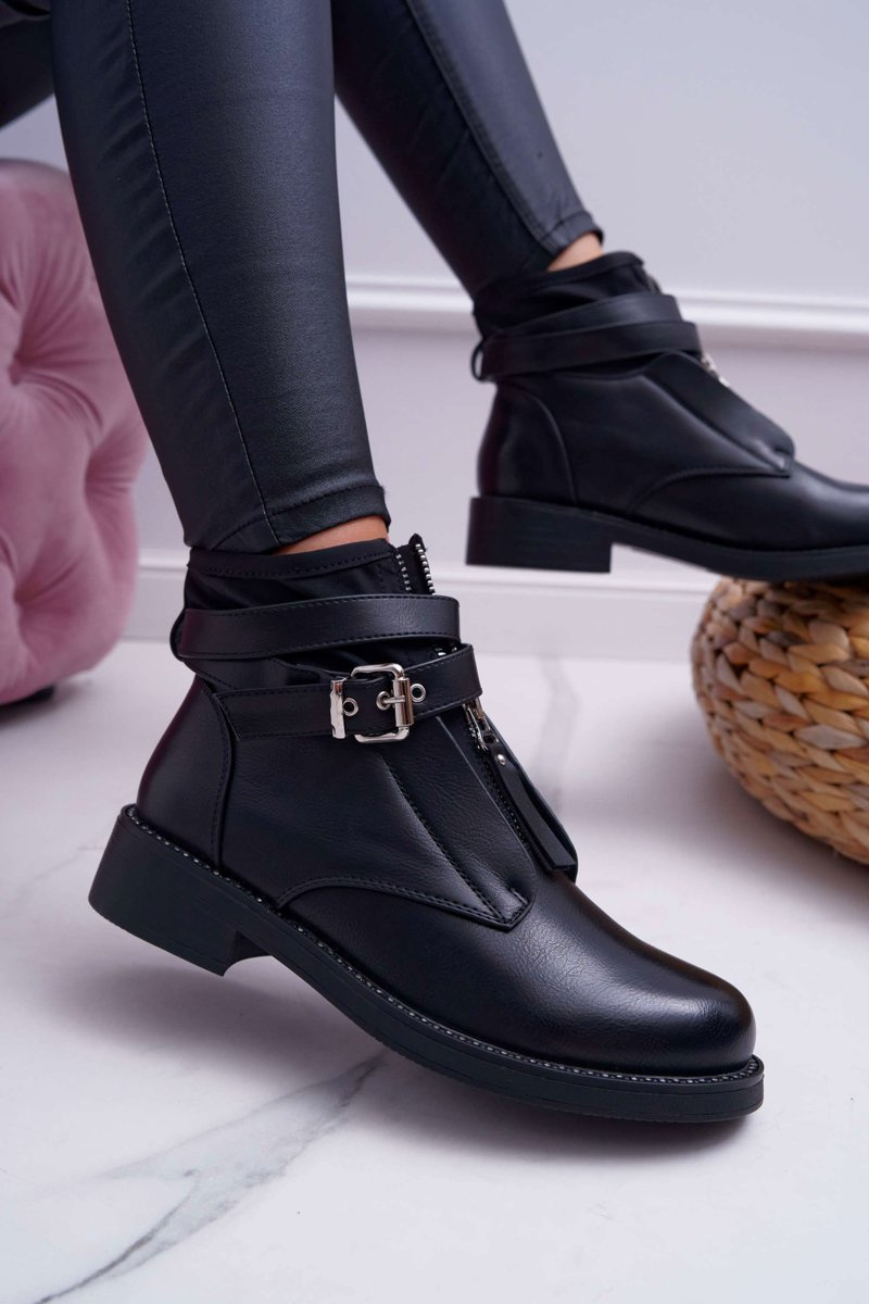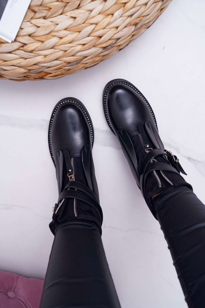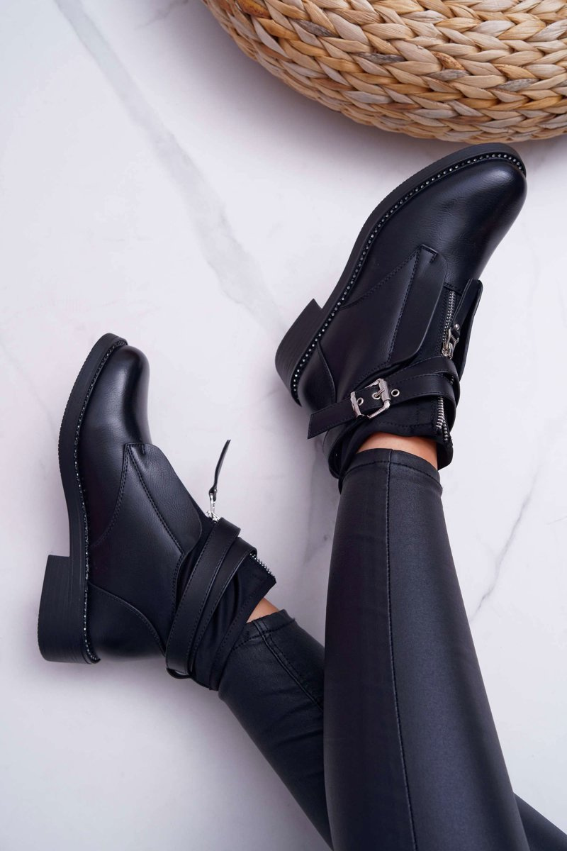 Botki Damskie Płaskie z Kryształkami Klamra Czarne Denovio