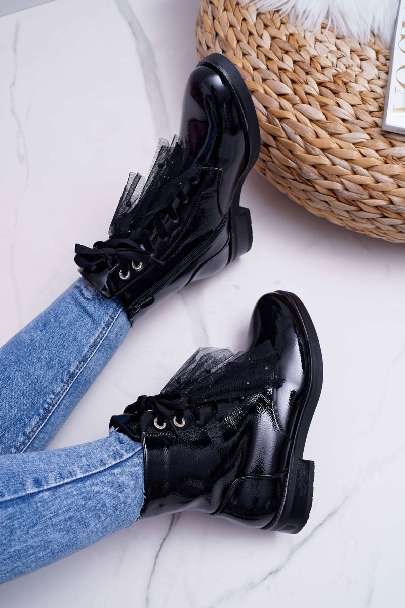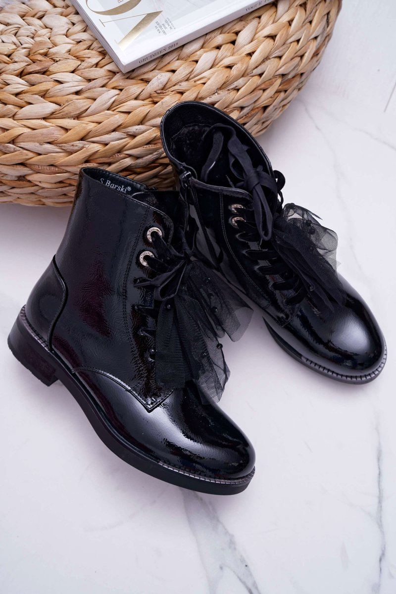 Eleganckie botki firmy S.BARSKI w kolorze czarnym. Wykonane z wysokiej jakości eko - skóry lakierowanej. Posiadają ocieplenie w postaci koca obuwniczego. Zdobienie w postaci kokardy przy sznurowaniu. Podczas wyboru rozmiaru prosimy kierować się tabelą rozmiarów.