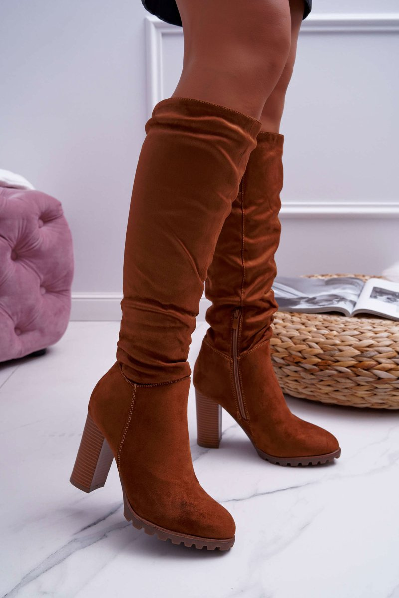 Kozaki Damskie Na Słupku Zamszowe Camel Marion