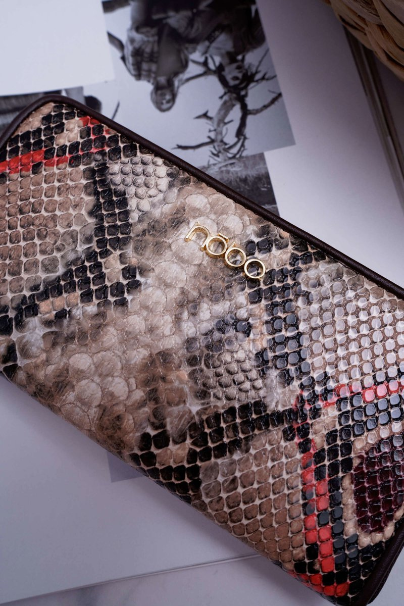Elegancki damski portfel renomowanej marki NOBO. Klasyczny wężowy wzór wykonany ze skóry ekologicznej. Portfel zapinany na suwak. Wewnątrz znajduje się miejsce na 8 kart bądź innych dokumentów oraz cztery komory z czego jedna zapinana jest na suwak. Portfel zapakowany jest w eleganckie czarne pudełko z logiem marki.