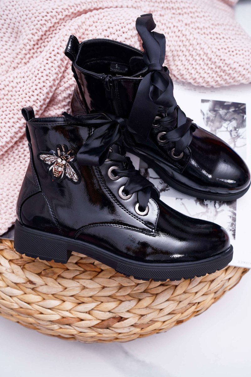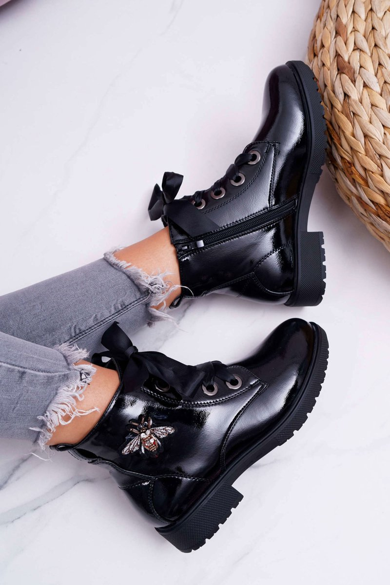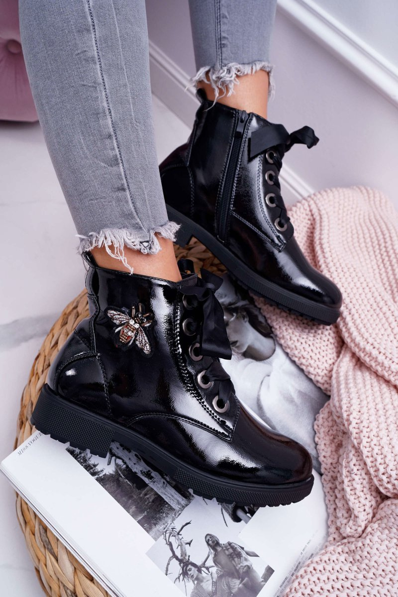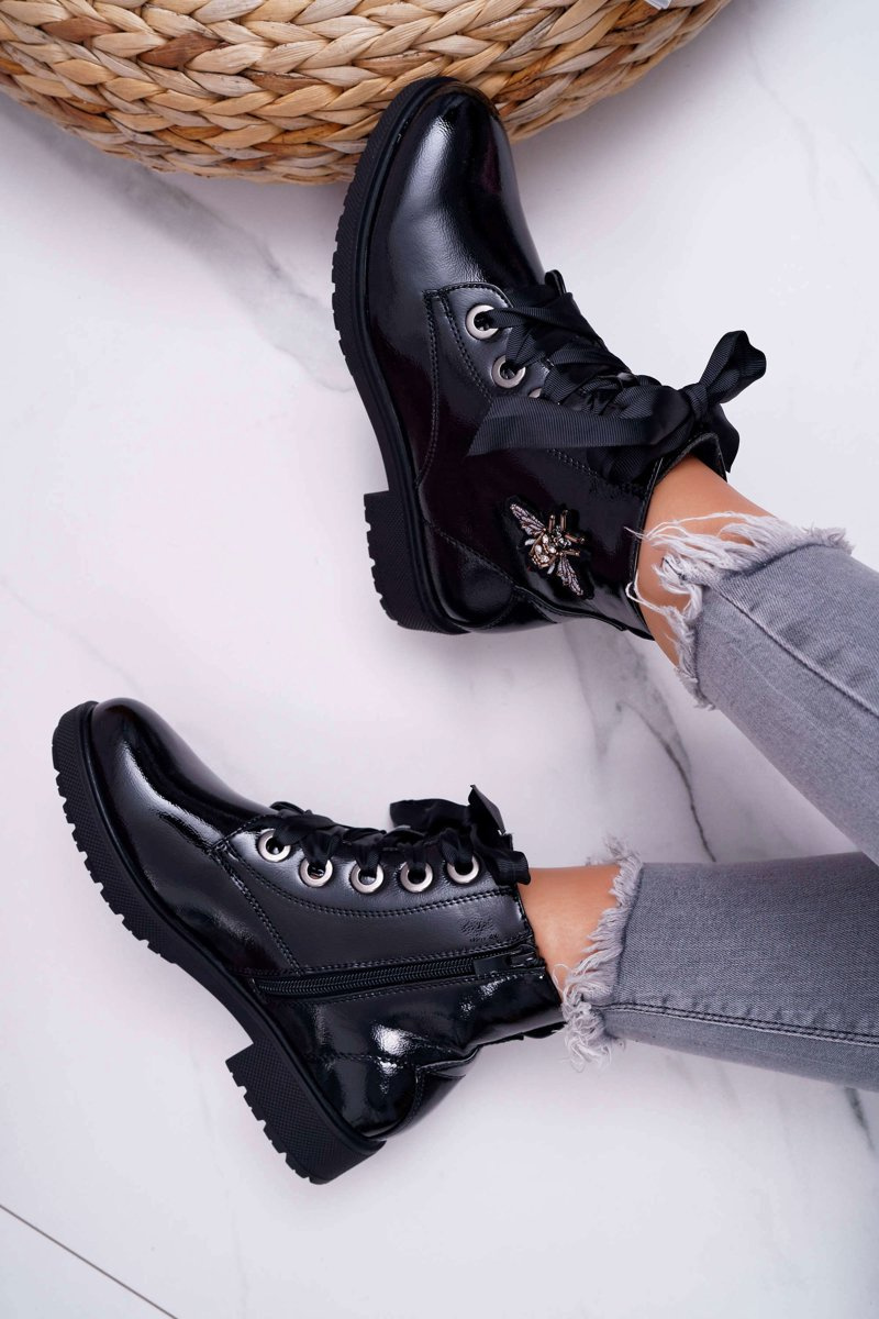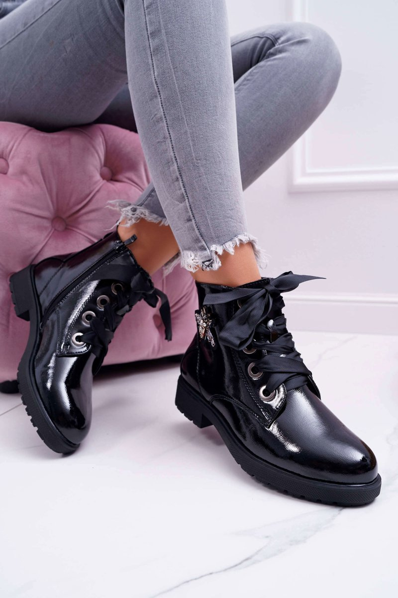 Botki Damskie Płaski Obcas Glany Lakierowane Czarne Sergio Leone BT530