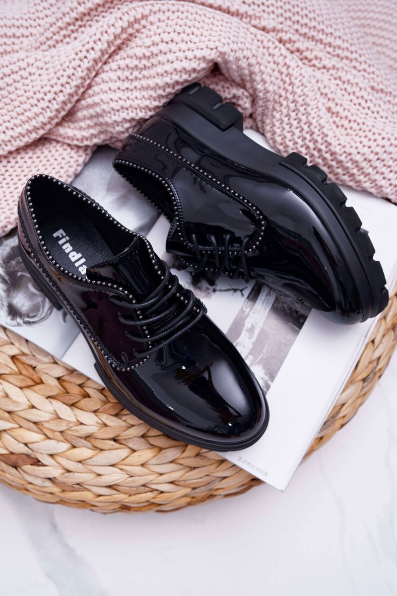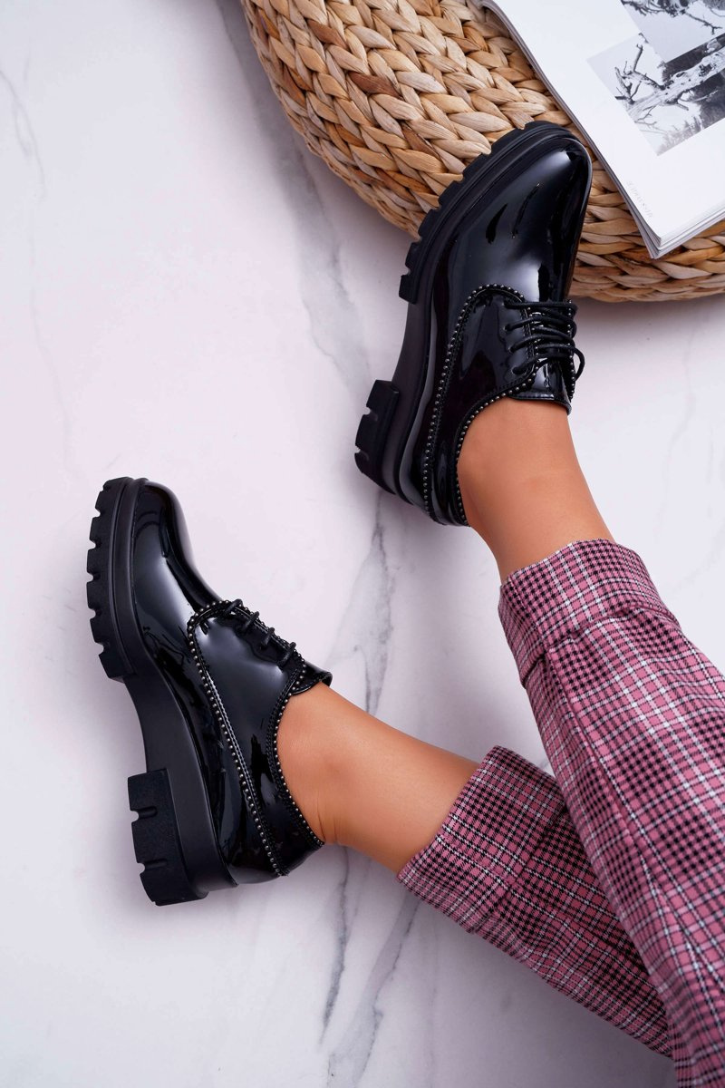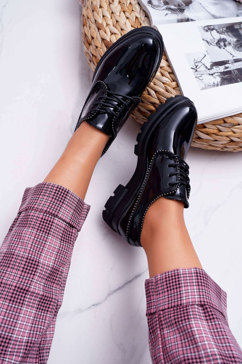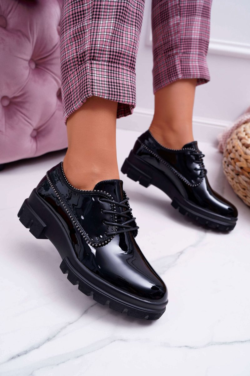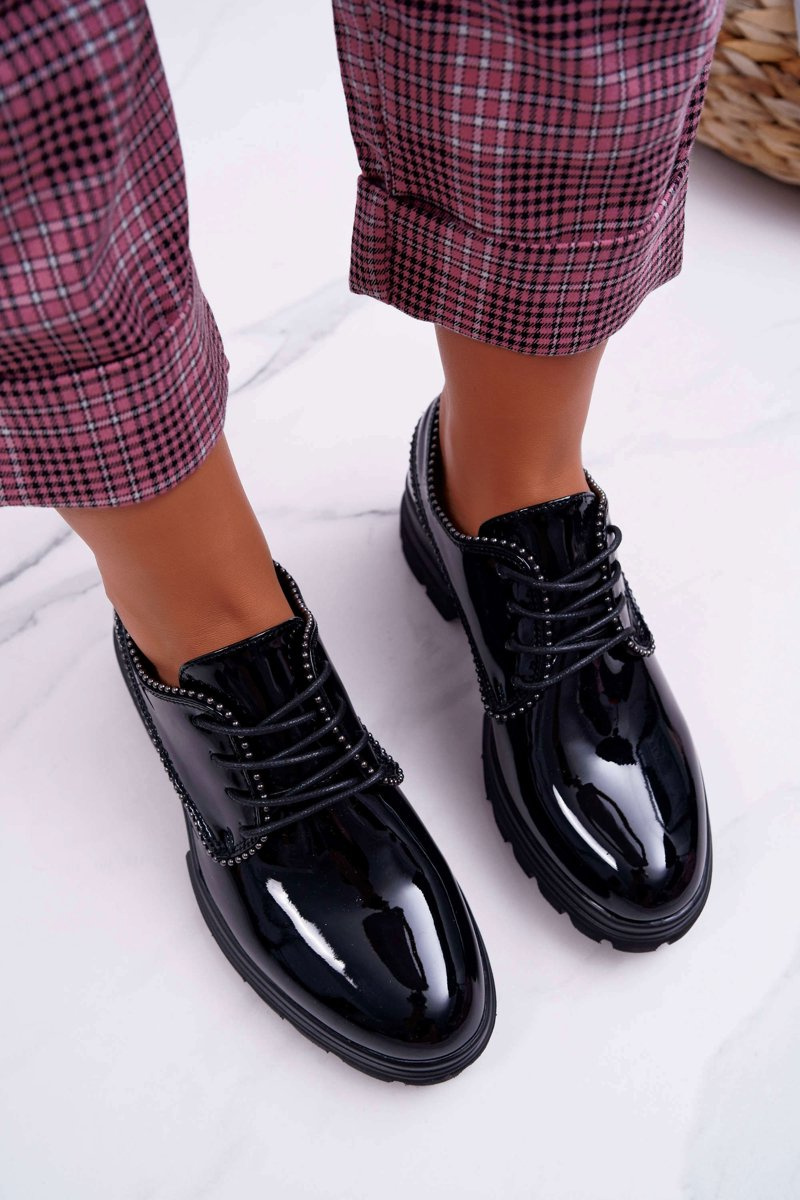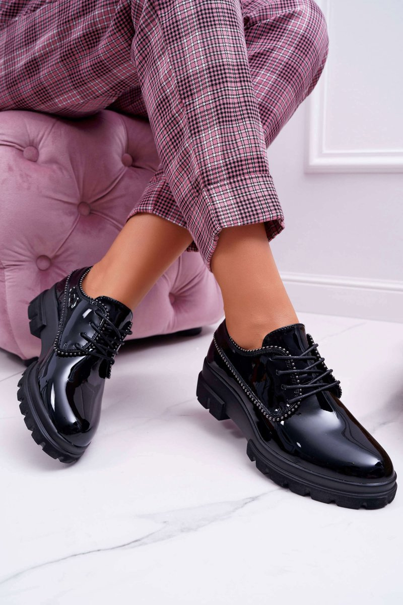Klasyczne półbuty, które podkreślą każdą naszą stylizację. Modny, lakierowany kolor w połączeniu ze srebrnymi nitami. Gruba podeszwa podkreśla ich mocny styl. Przy wyborze rozmiaru prosimy sugerować się tabelą rozmiarów, która dostępna jest po najechaniu bądź kliknięciu w dany rozmiar.
